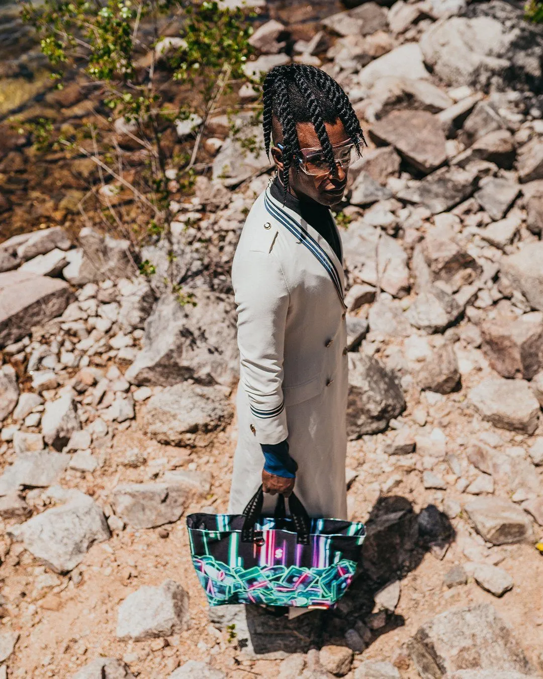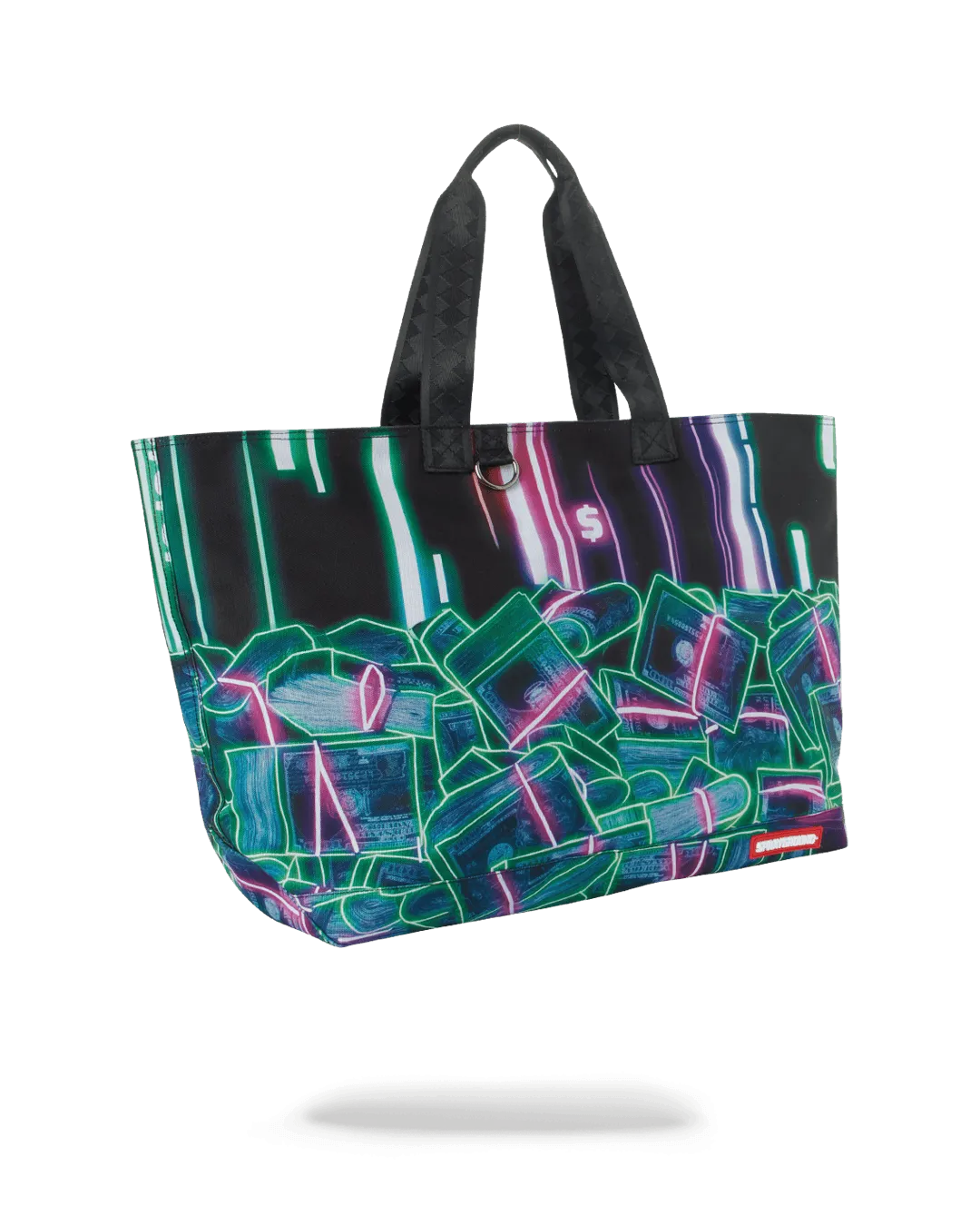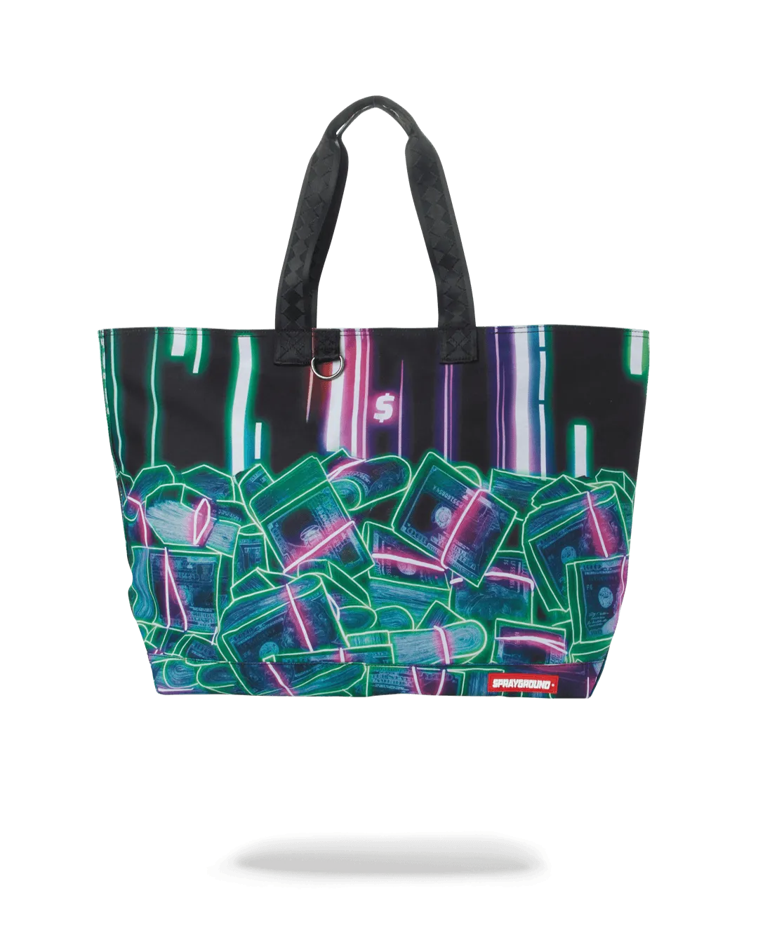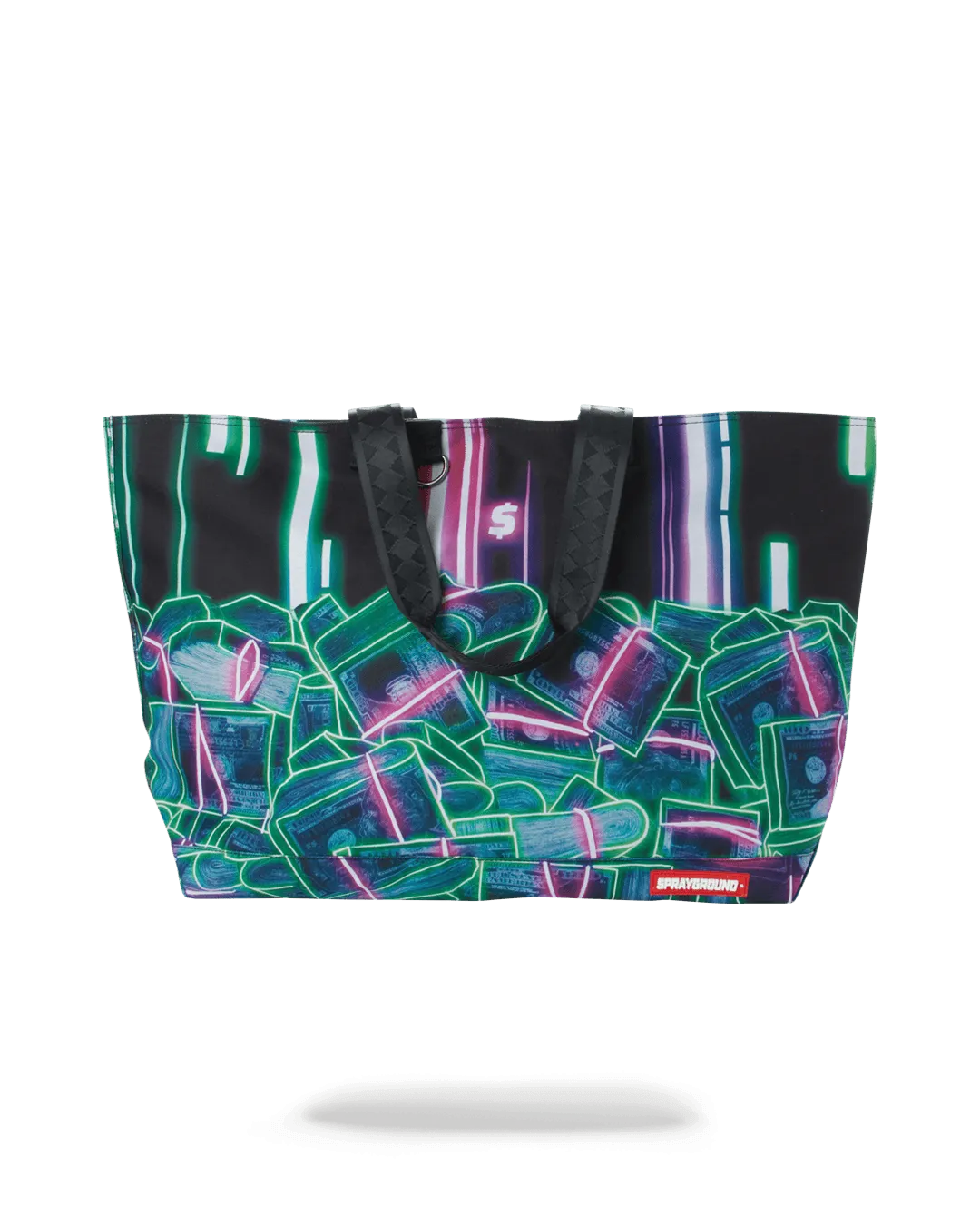 SPRAYGROUND 2077. The Neon Lights of Shark City Glow at Night with The New Limited Edition Crypto Stacks & Nite Dragon Backpacks, Luggage, Tote, Pouch & FaceMask. GLOWS NOW!