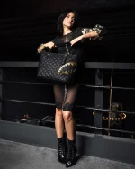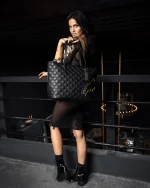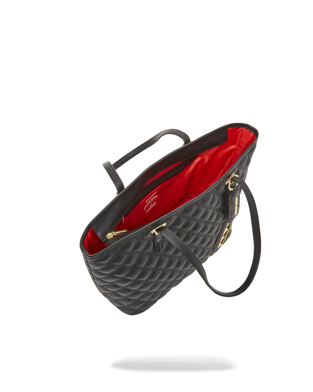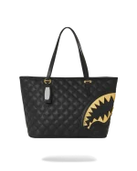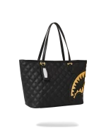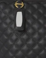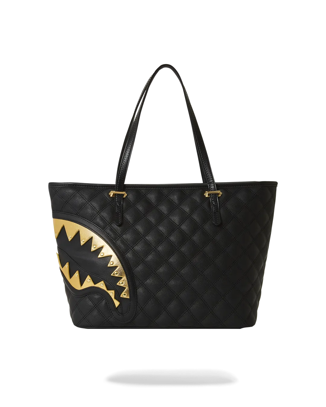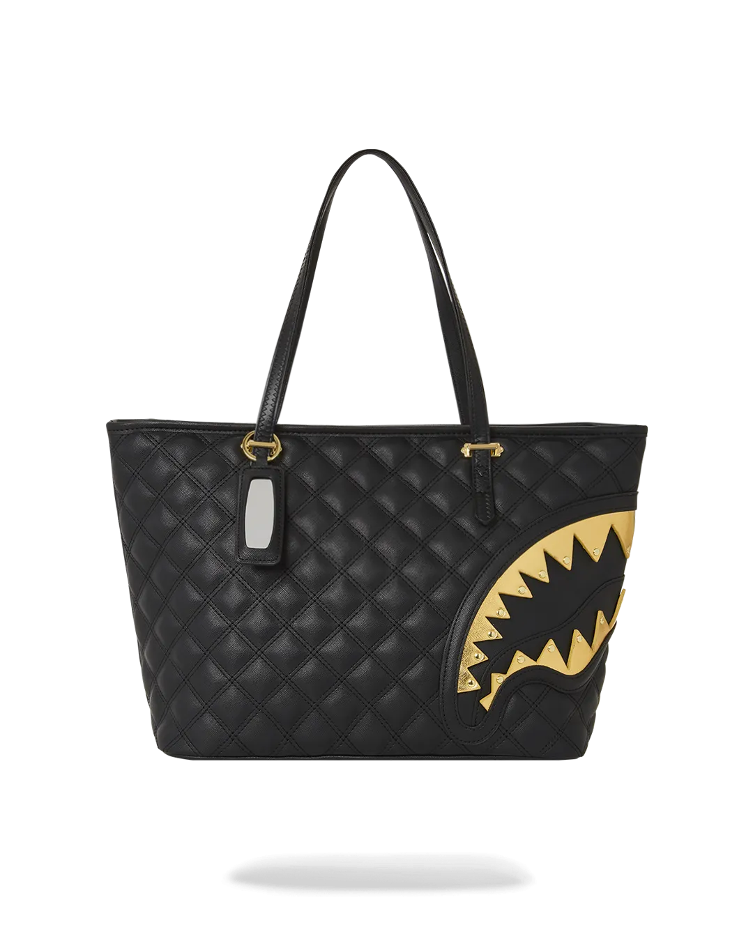Sophisticated quilted faux leather collection. Accented with metallic gold shark mouths and nail head hardware details.