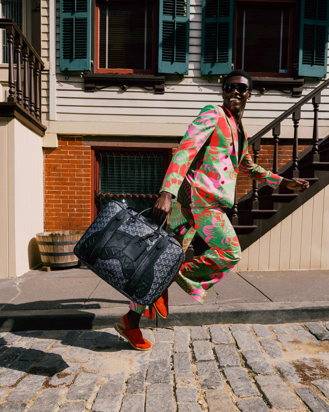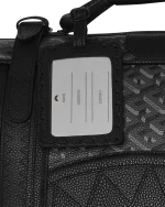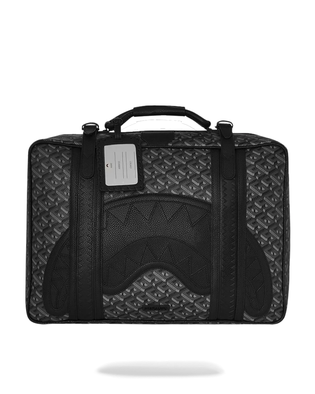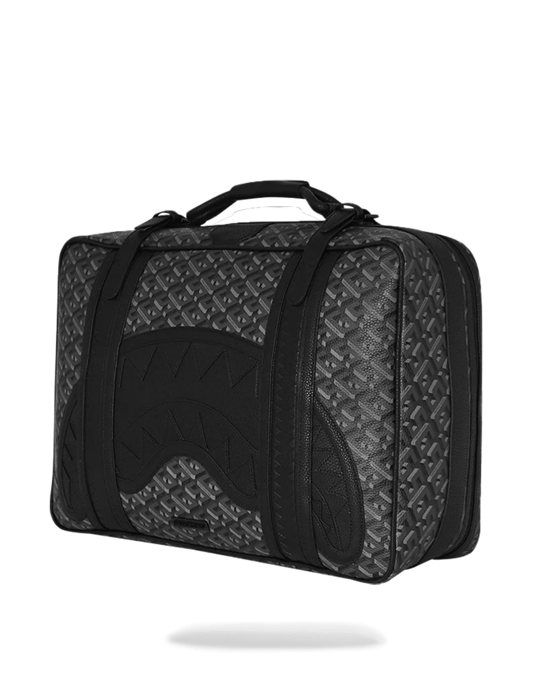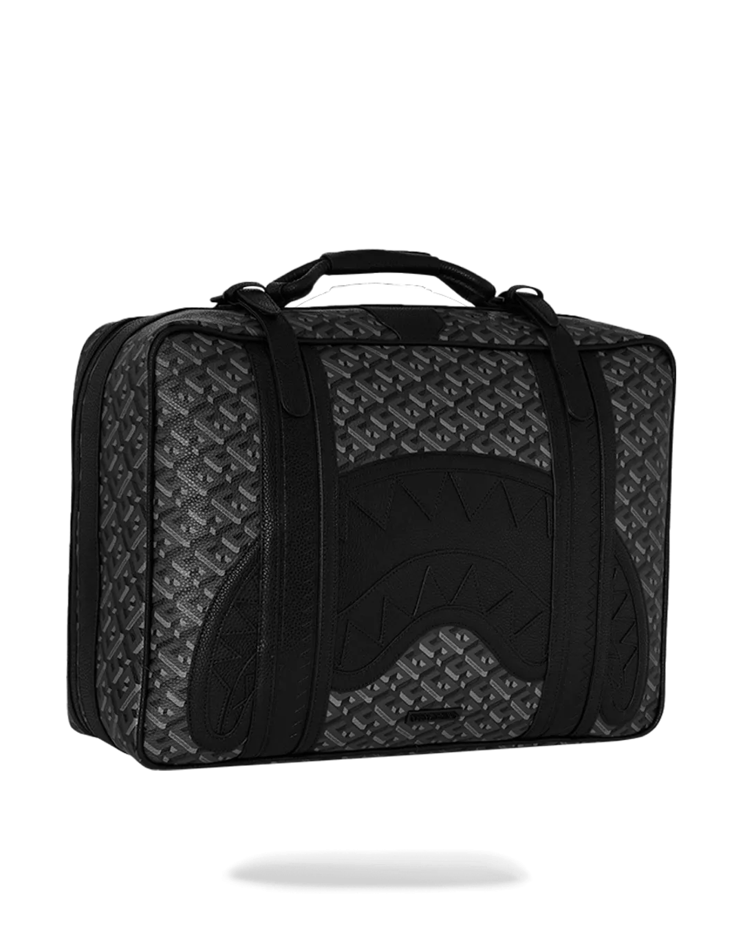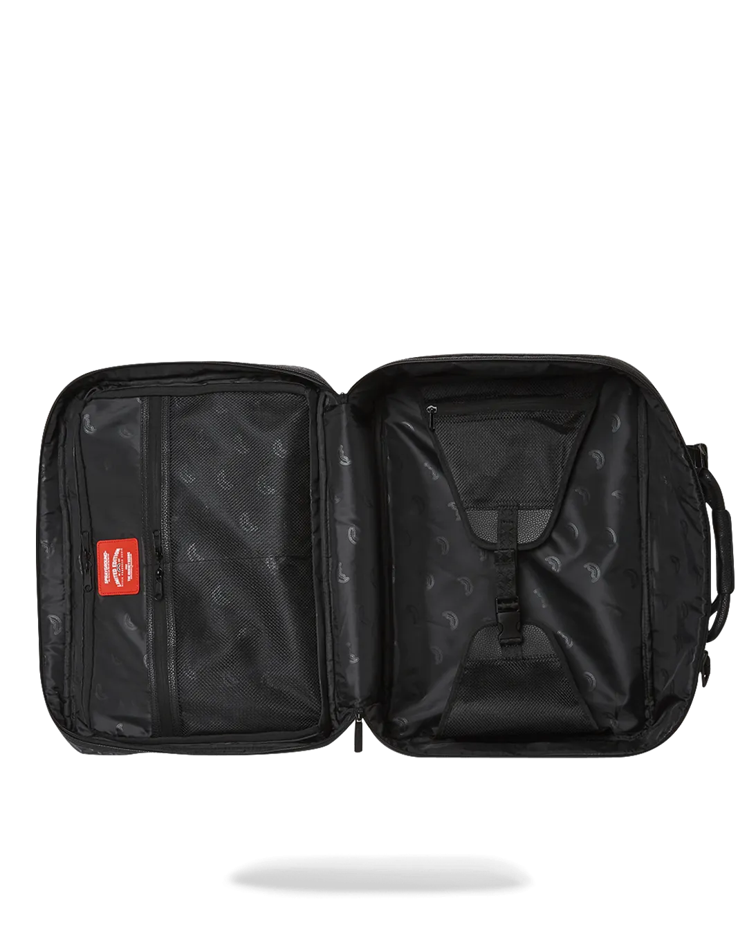 Features: Leather handle, secure buckle closure, whip stitching features, vertical sharkmouth embossed details, converts from backpack to handheld briefcase, embossed sharkmouth, includes luggage tag, 2 exterior zipper pockets, luggage sleeve, 4 interior mesh pockets, large interior pocket, clothing compression straps, includes adjustable backpack straps, embossed zipper pulls.