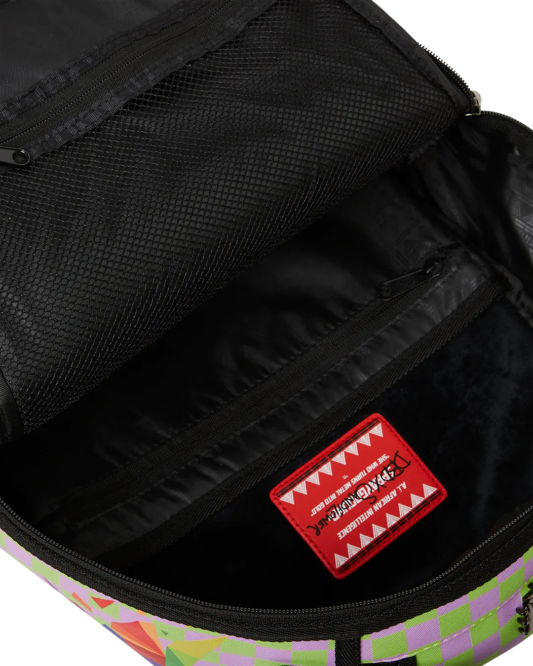 Dimensions: 18″ x 6″ x 11.5″ ? Front zipper pocket ? Side pockets ? Zippered Stash pocket ? Separate velour sunglass compartment ? Ergonomic mesh back padding ? Adjustable Straps for custom sizing ? Gold zippers with metal hardware ? Metal “Sprayground Authentic” badge ? Slide through back sleeve connects to carry-on luggage to free your hands