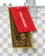 Dimensions: 20″ x 10″ x 10.75″ ? Metal zipper pocket??Back Zippers ?Zippered sneaker pocket ? gold zippers ? Adjustable Straps for custom sizing ?Metal Zippers with Metal Hardware ? bag of Sprayground money