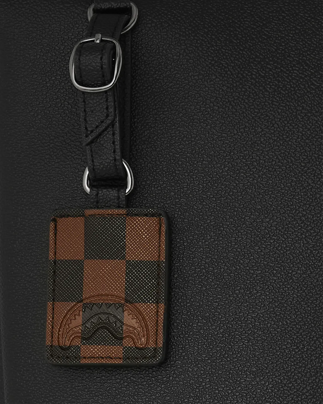PVC bag with embossed details such as the sharkmouth, zipper pullers, and ID tag. Sewn faux leather details around the front zipper pocket and ID tag.