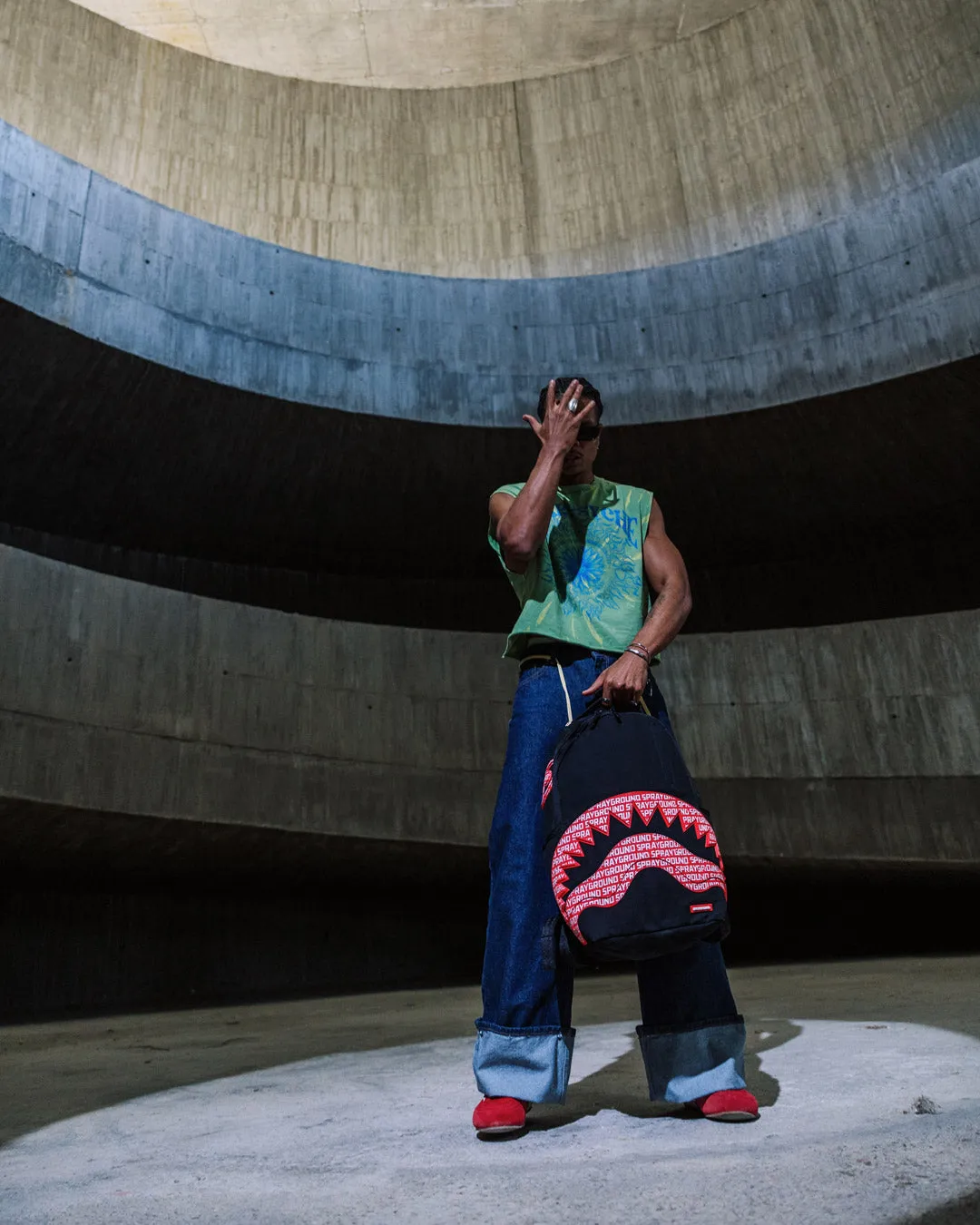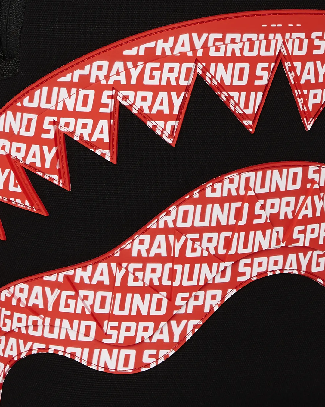 Cotton backpack featuring rubber mouth and eyes with Sprayground repeat pattern