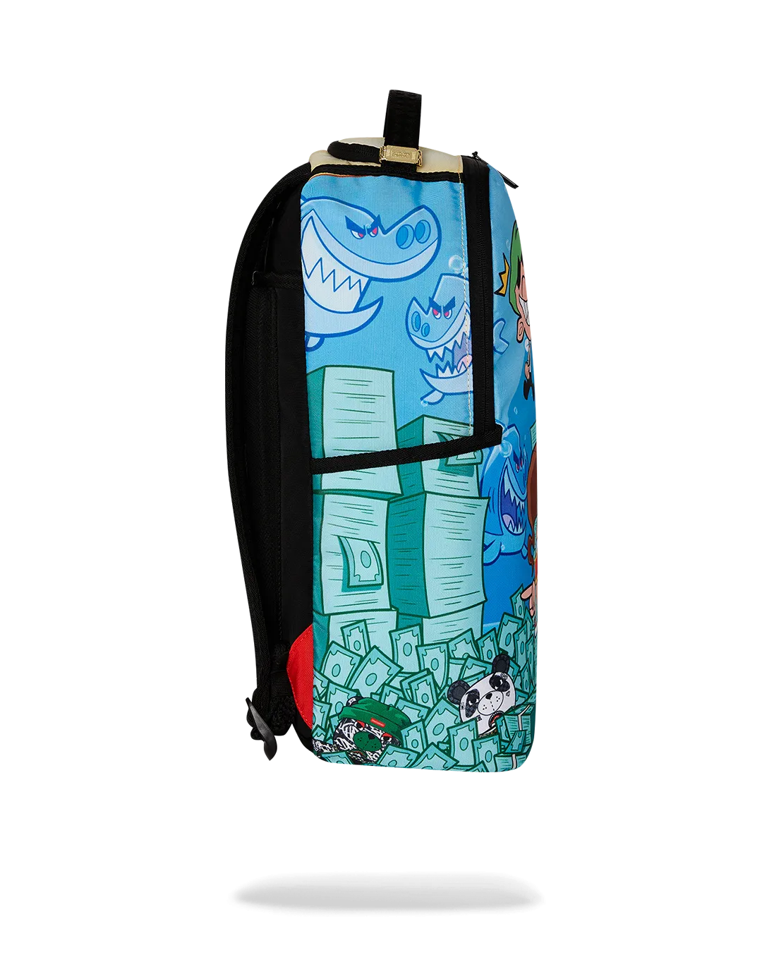 Dimensions: 18″ x 6″ x 11.5″ ? Front zipper pocket ? Side pockets ? Zippered Stash pocket ? Separate velour sunglass compartment ? Ergonomic mesh back padding ? Adjustable Straps for custom sizing ? Gold zippers with metal hardware ? Metal “Sprayground Authentic” badge ? Slide through back sleeve connects to carry-on luggage to free your hands