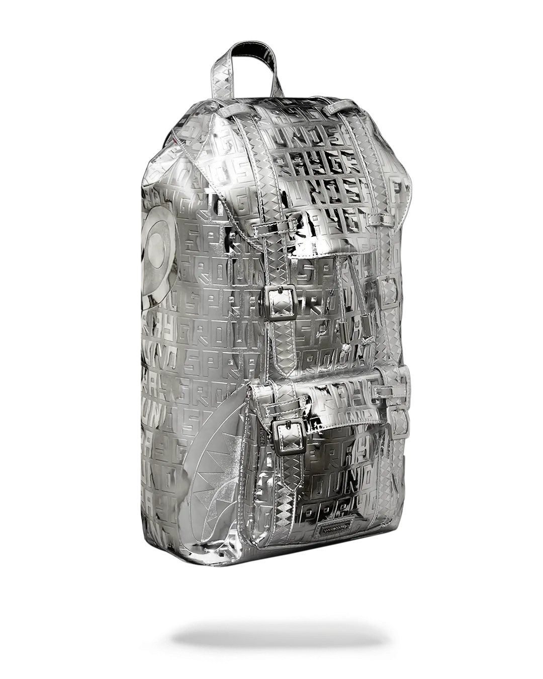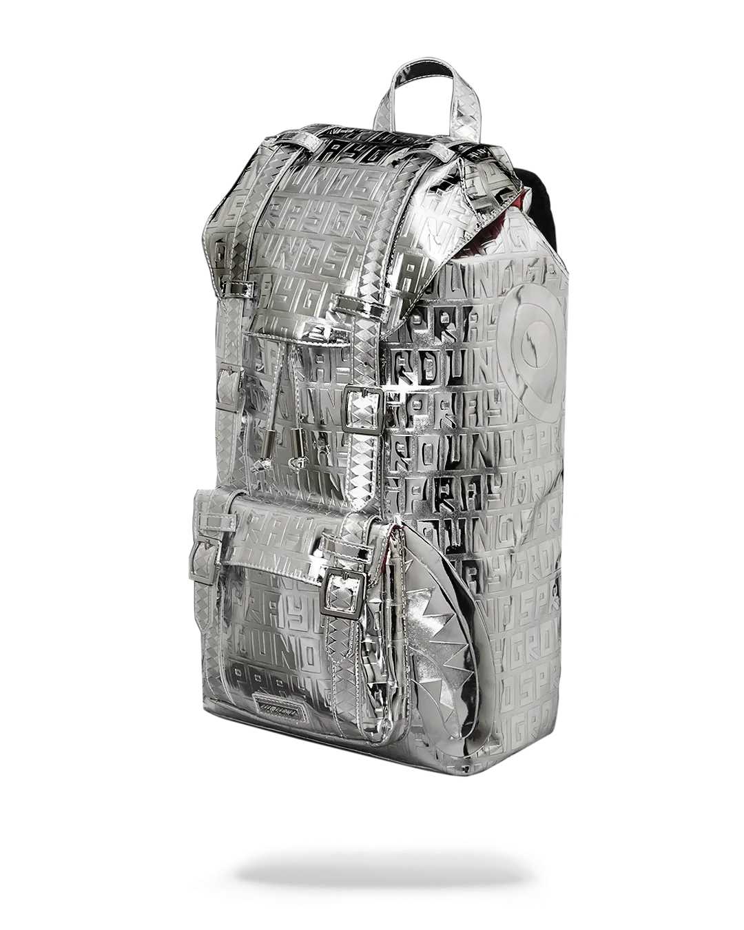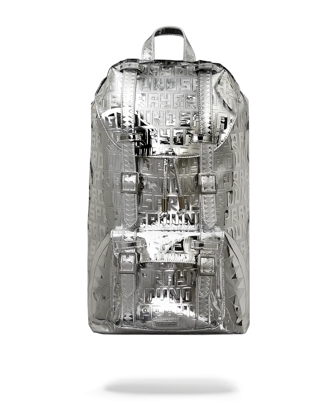 Embossed Sprayground logo on Metallic Silver PU with mirror-like shine