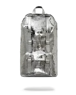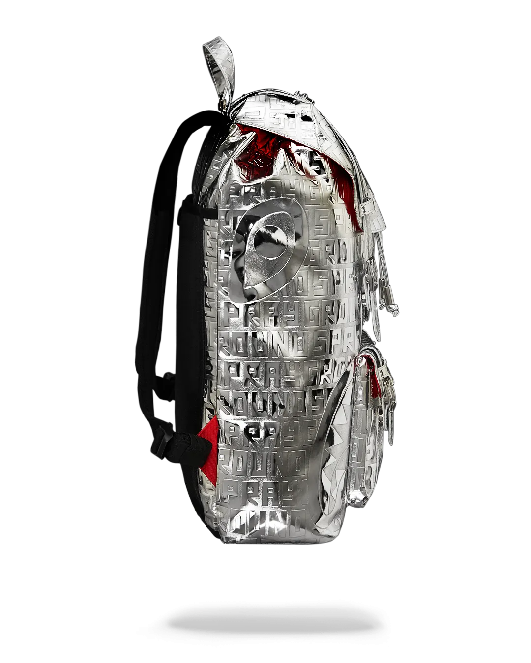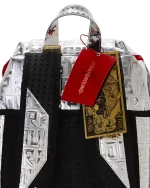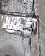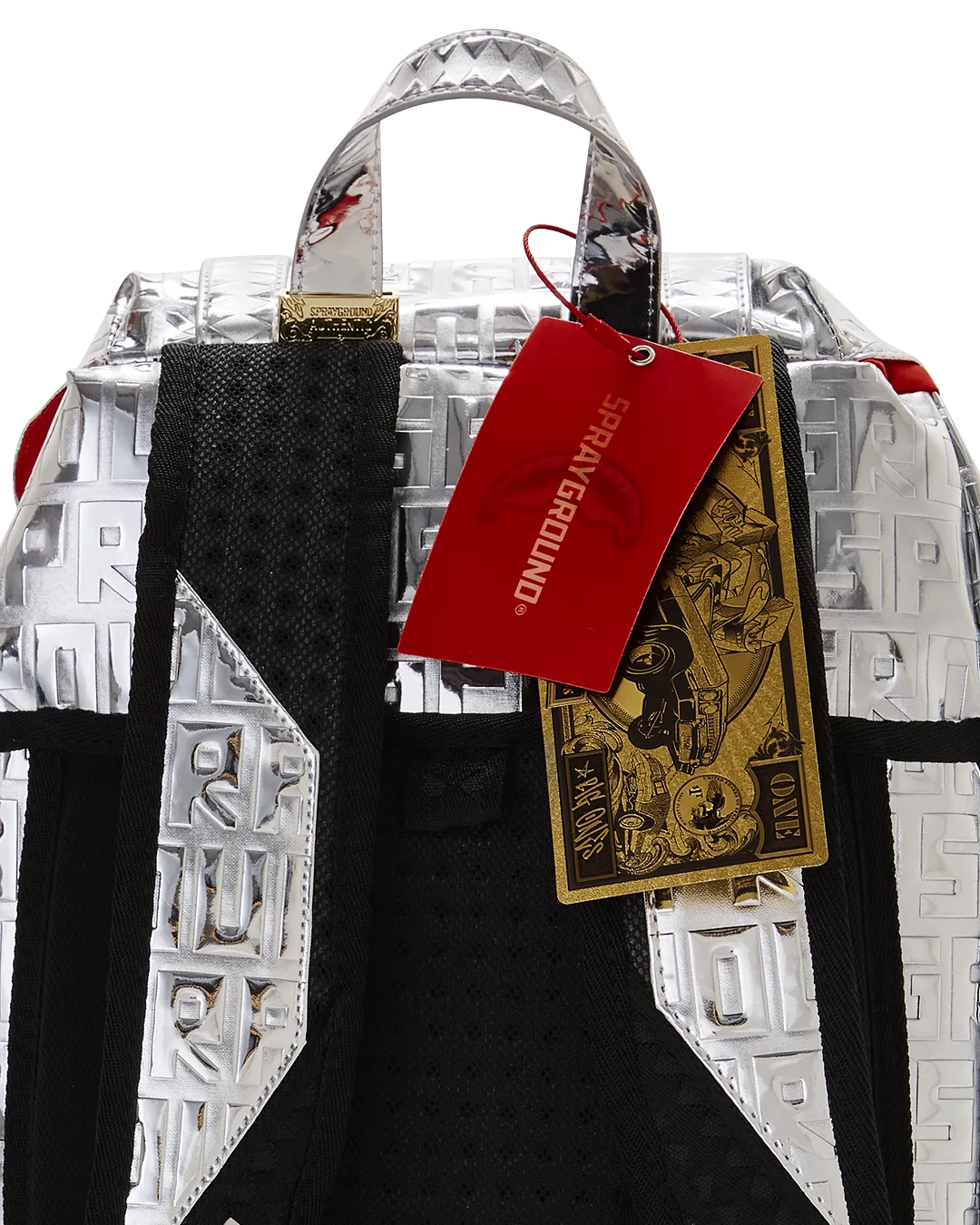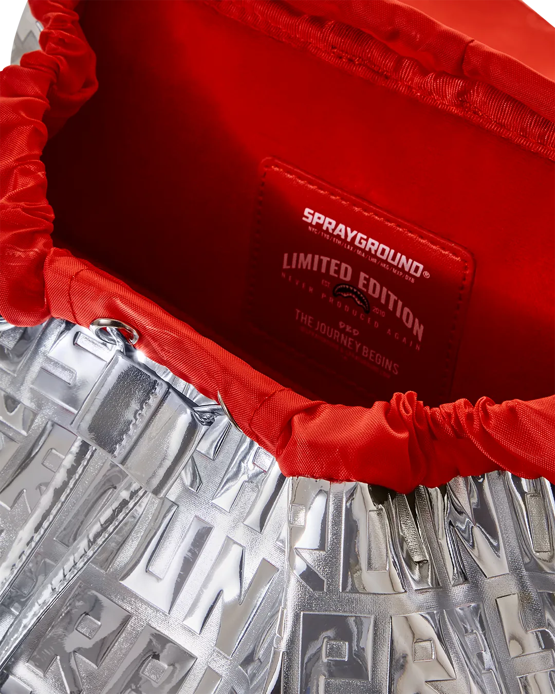 Embossed Sprayground logo on Metallic Silver PU with mirror-like shine