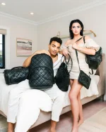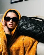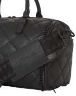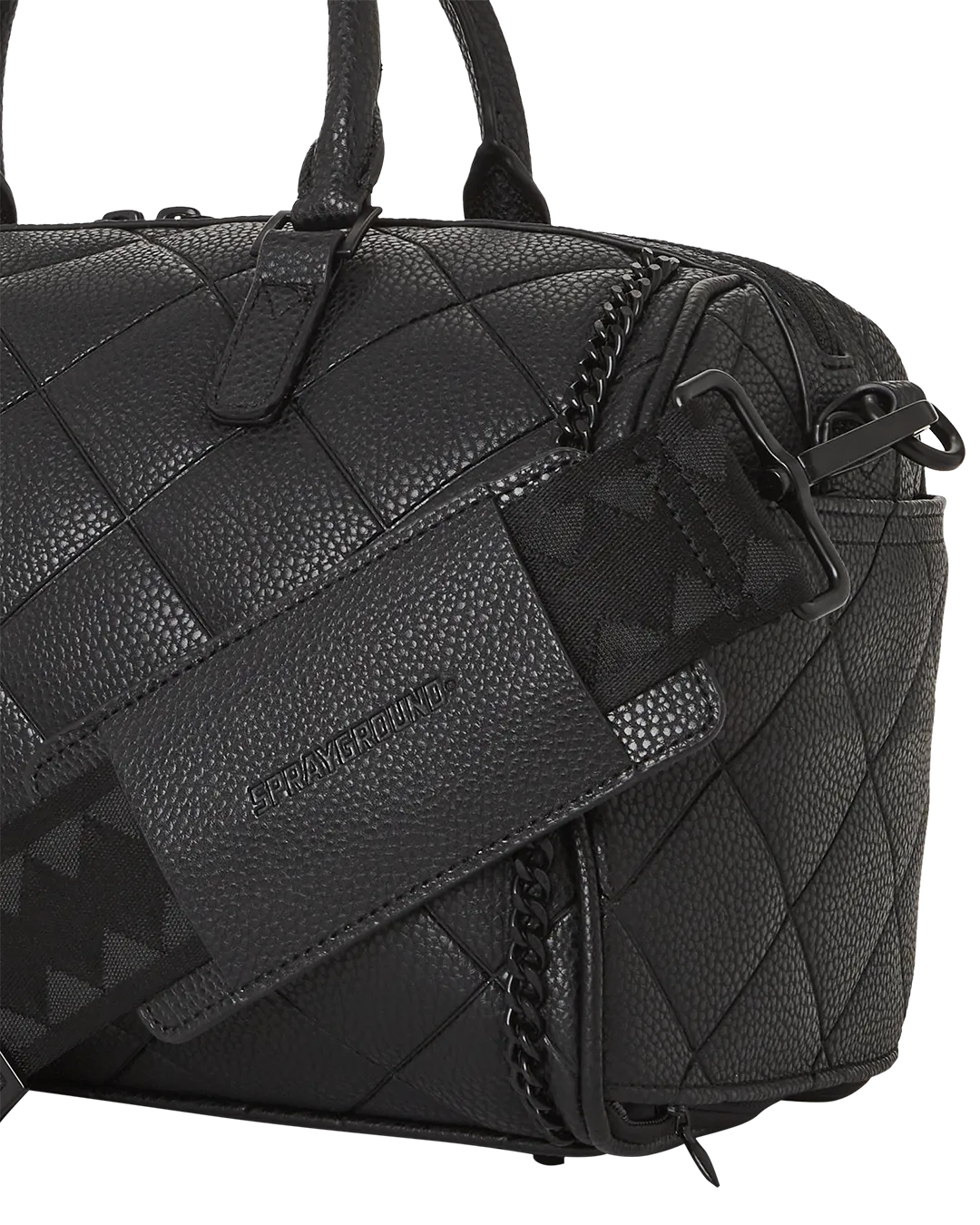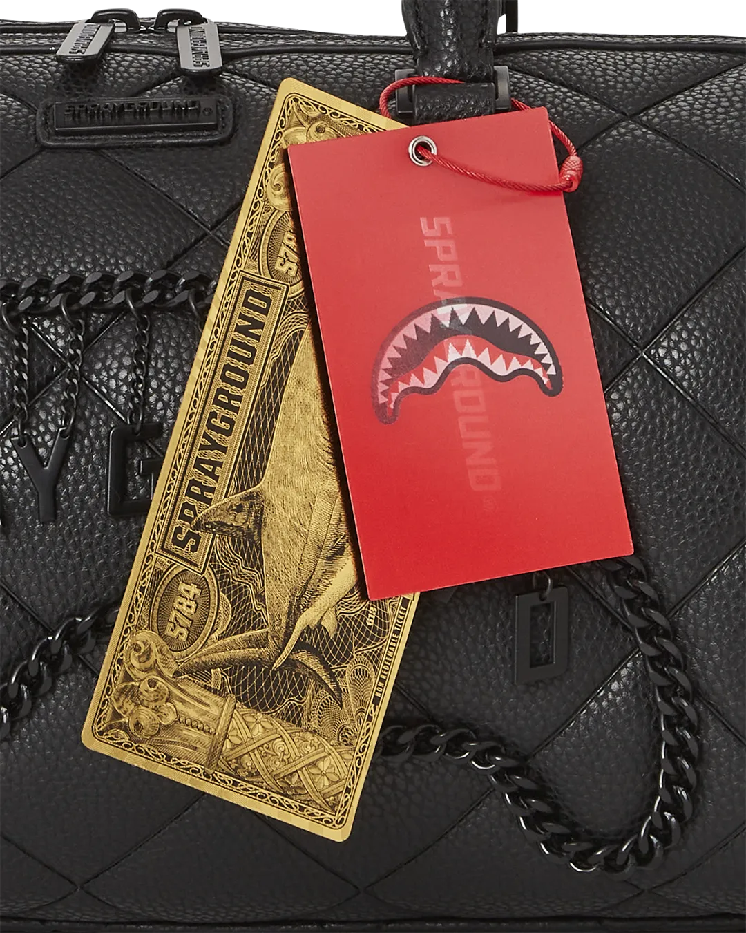 100% PVC quilted black faux leather featuring black chain hardware and hanging charm logo.