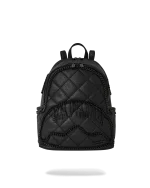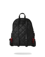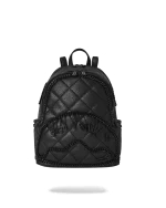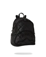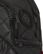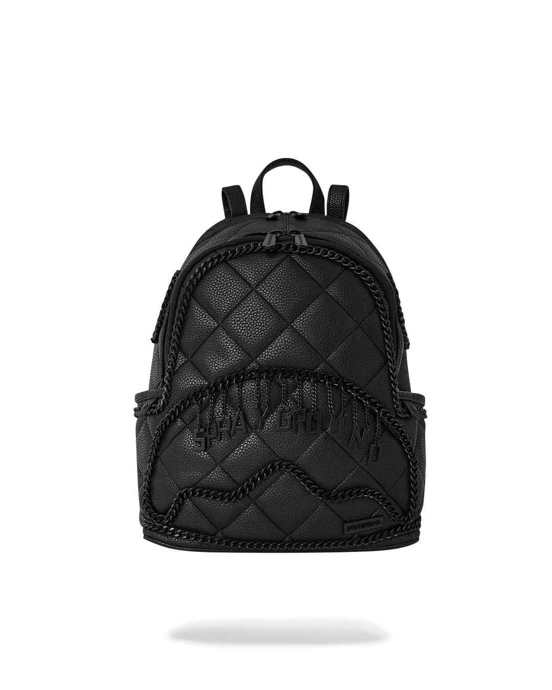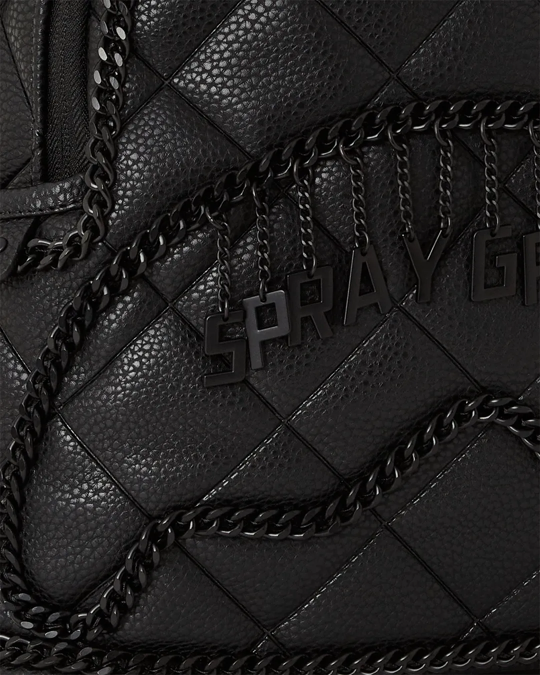 100% PVC quilted black faux leather featuring black chain hardware and hanging charm logo.
