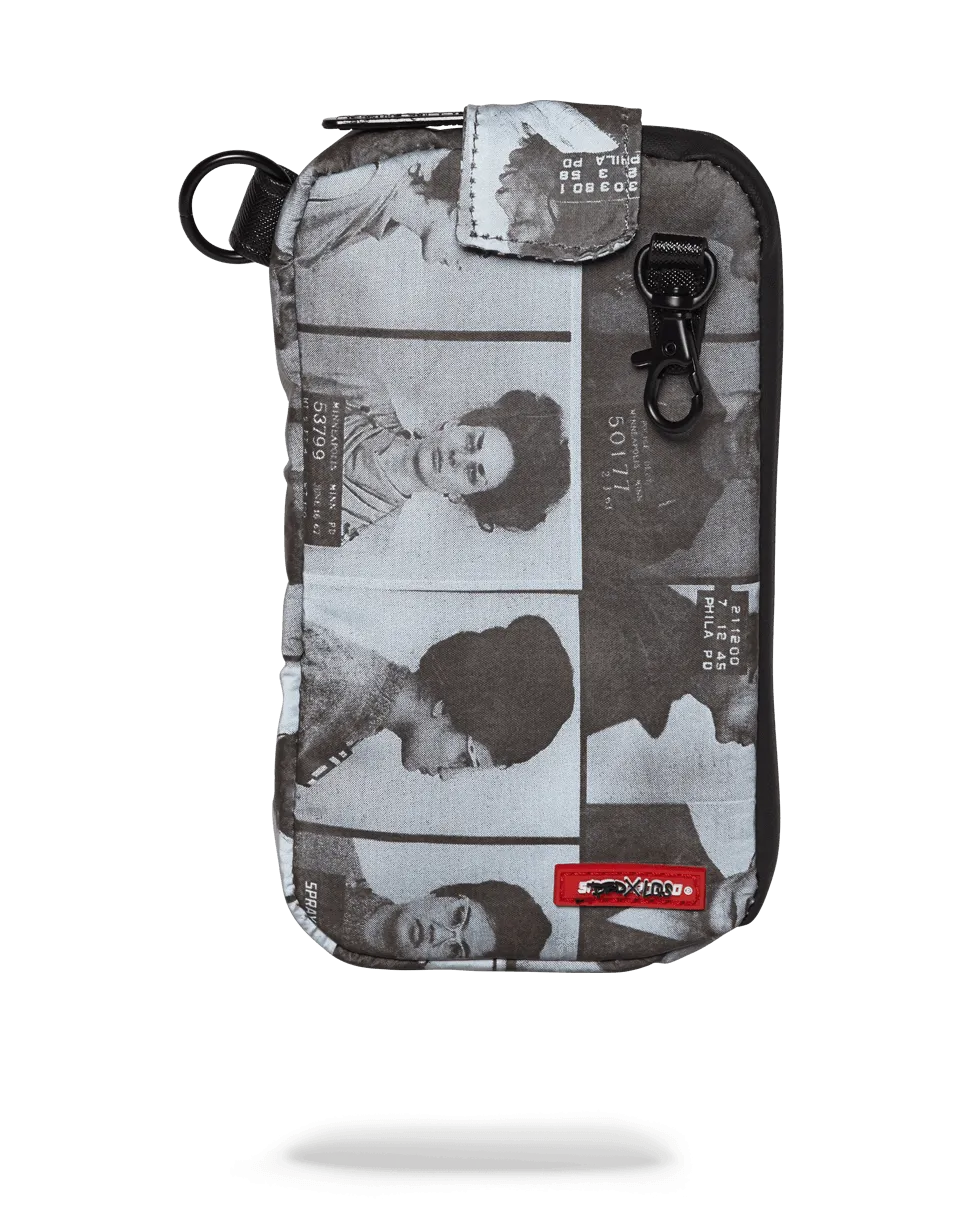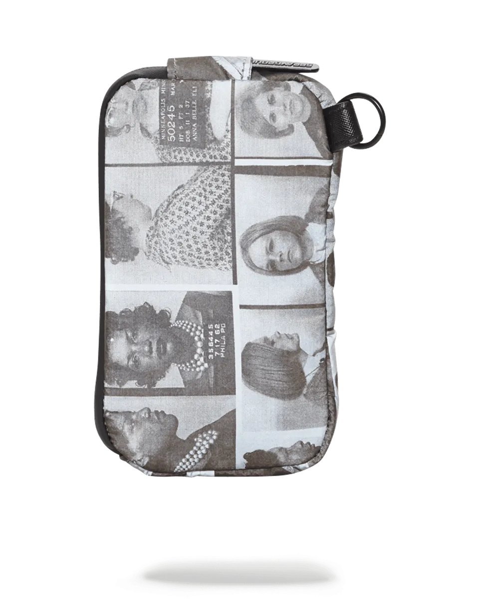 ?3M reflective small pouch keychain from LQS x DBD Collaboration?for Scammer Collection. Featuring black and white printed mugshots of powerful women convicted for crimes throughout history. Features smell-proof pockets.