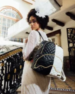 Dimensions: 10″ x 5″ x 11.5″ ? Two large main zippered compartments ? Side pockets ? Zippered Stash pocket ? Adjustable straps for custom sizing ? Gold zippers with metal hardware