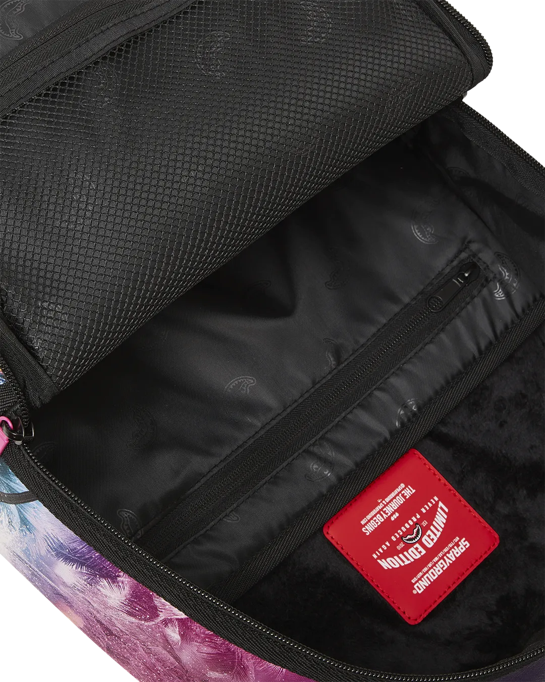 Dimensions: 18″ x 6″ x 11.5″ ? Front zipper pocket ? Side pockets ? Zippered Stash pocket ? Separate velour sunglass compartment ? Ergonomic mesh back padding ? Adjustable Straps for custom sizing ? Gold zippers with metal hardware ? Metal “Sprayground Authentic” badge ? Slide through back sleeve connects to carry-on luggage to free your hands