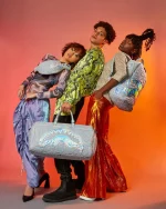 The styles are trimmed with matching faux leather trims and accented with iridescent welded shark mouths and gunmetal hardware.