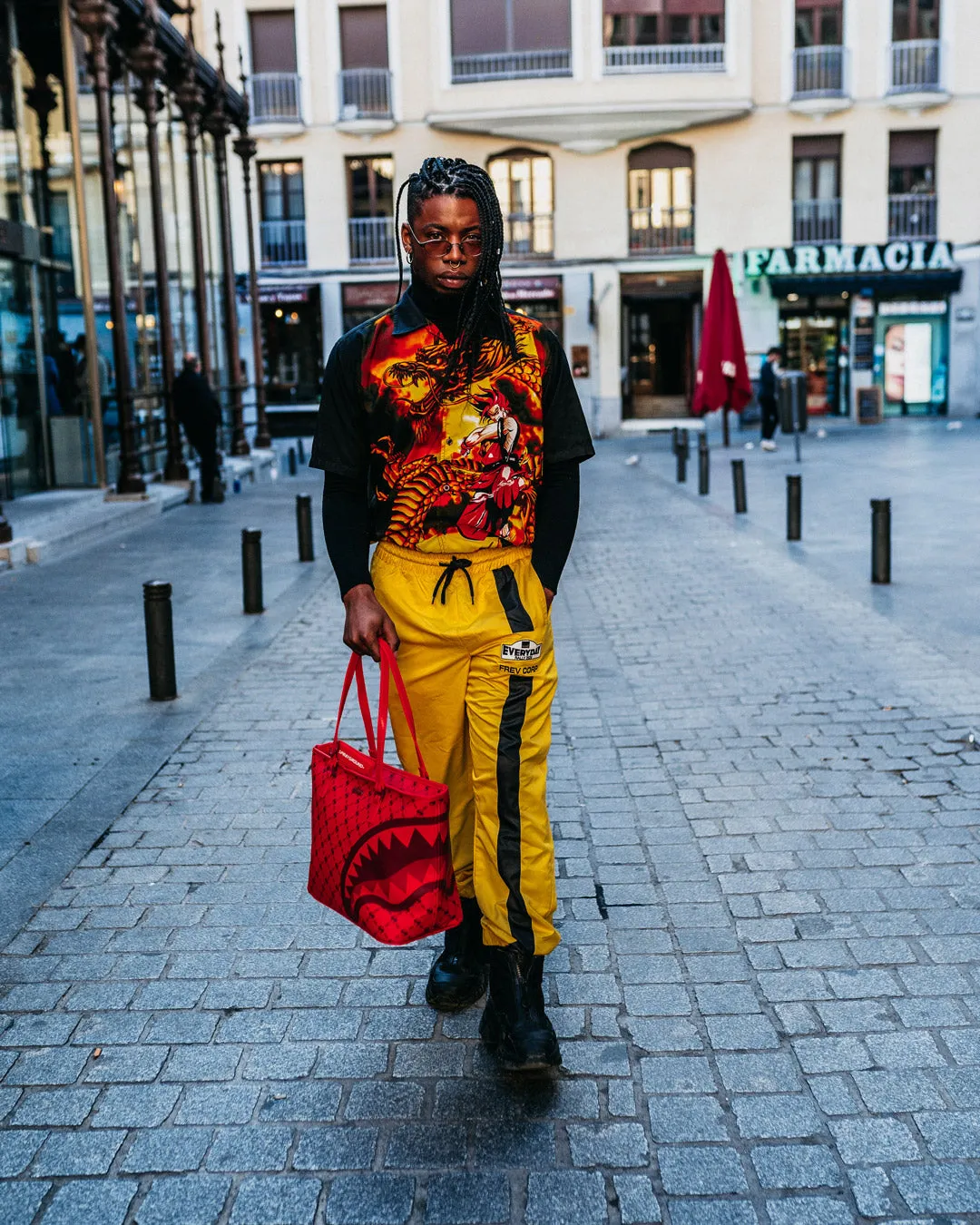 Dimensions: 19″ x 6.5″ x 11.5″ ? Top zipper opening ? Top double handle ? Sprayground keychain ? Gold zippers with metal hardware