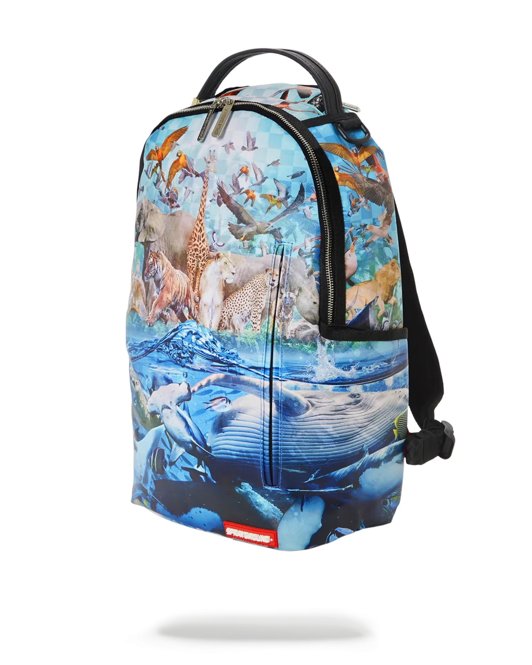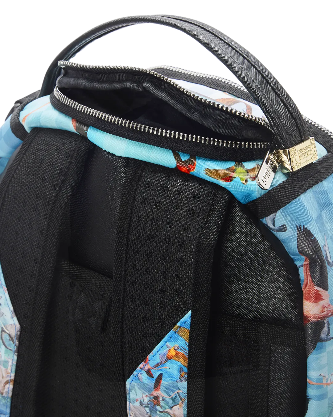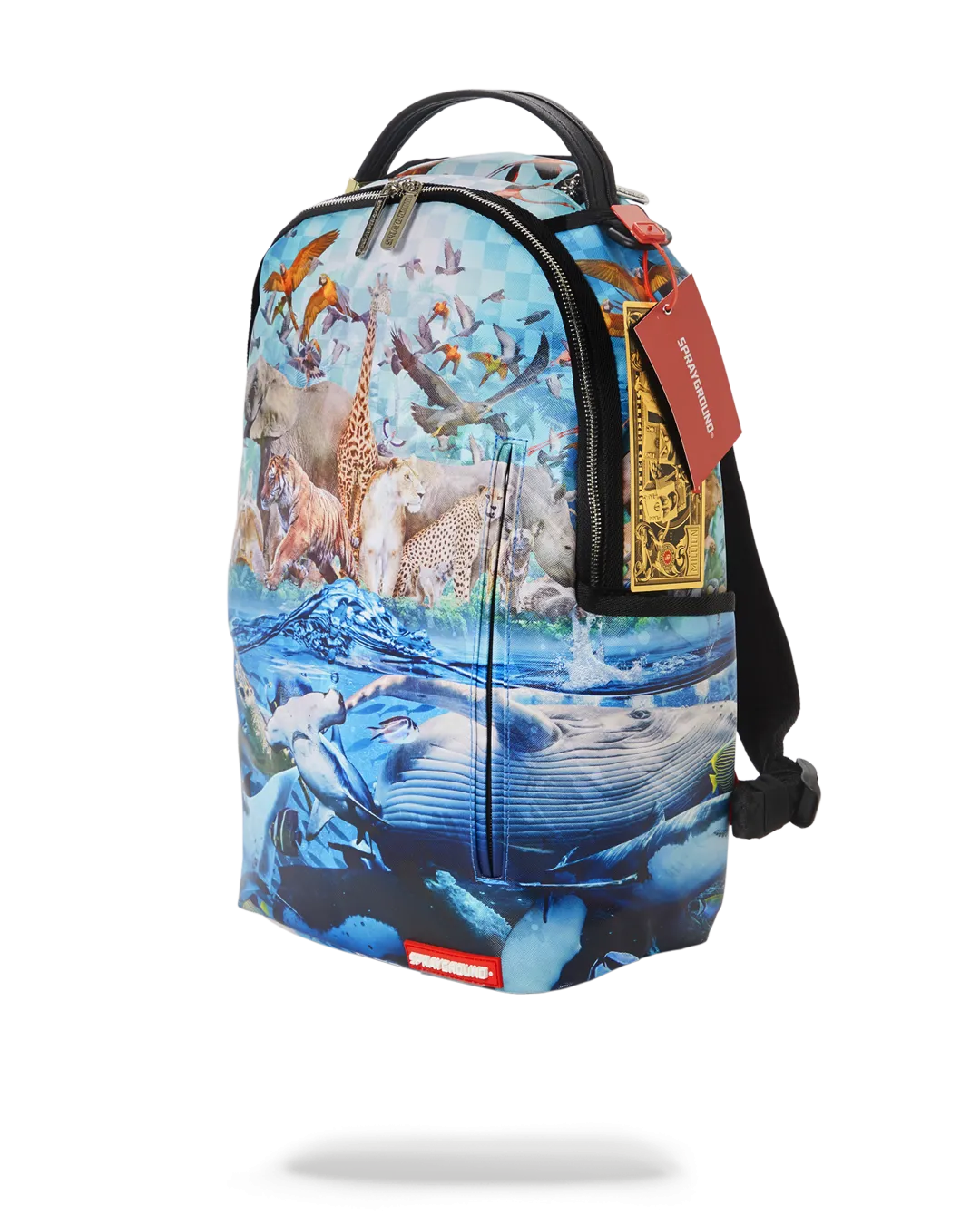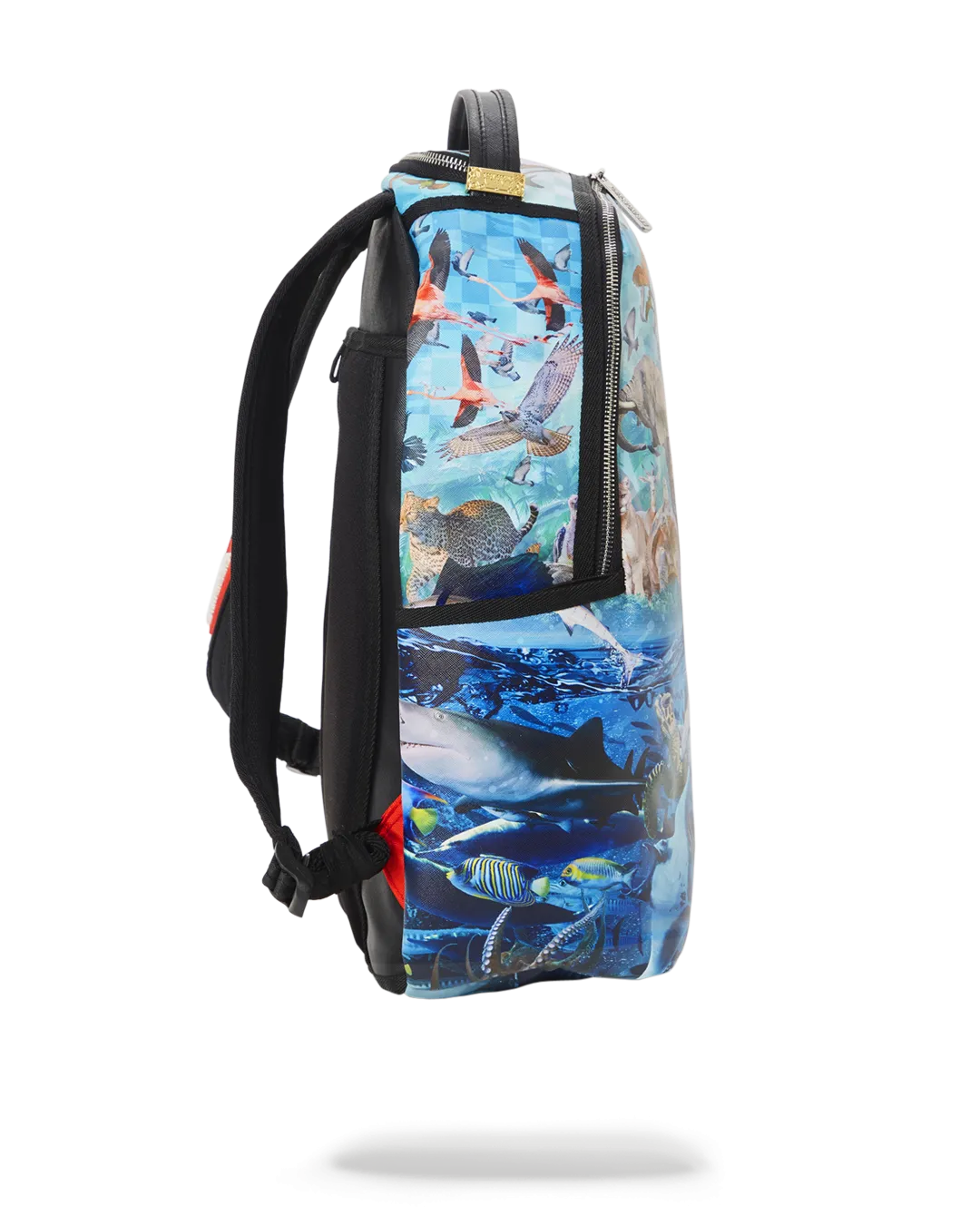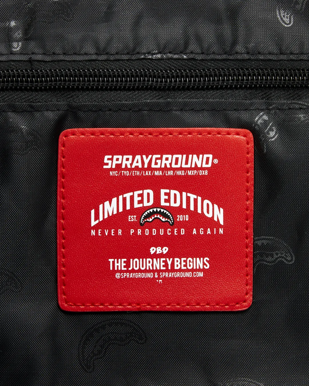 Dimensions: 18″ x 6″ x 11.5″ ? Front zipper pocket ? Side pockets ? Zippered Stash pocket ? Separate velour sunglass compartment ? Ergonomic mesh back padding ? Adjustable Straps for custom sizing ? Gold zippers with metal hardware ? Metal “Sprayground Authentic” badge ? Slide through back sleeve connects to carry-on luggage to free your hands