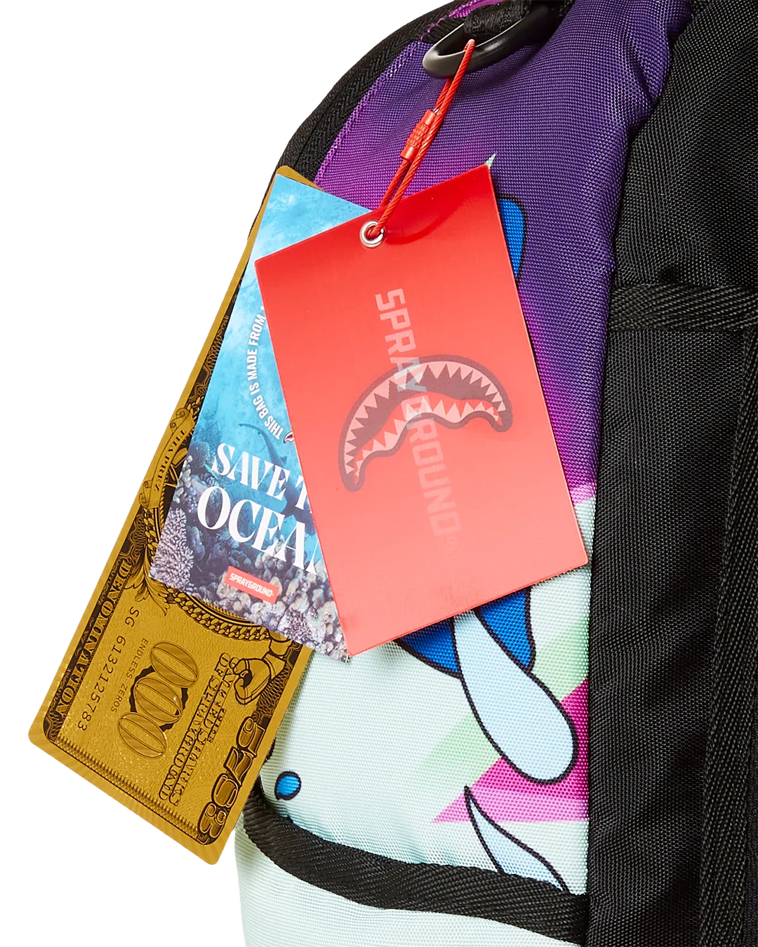 Dimensions: 18″ x 6″ x 11.5″ ? Front zipper pocket ? Side pockets ? Zippered Stash pocket ? Separate velour sunglass compartment ? Ergonomic mesh back padding ? Adjustable Straps for custom sizing ? Gold zippers with metal hardware ? Metal “Sprayground Authentic” badge ? Slide through back sleeve connects to carry-on luggage to free your hands