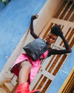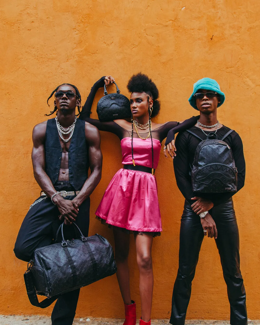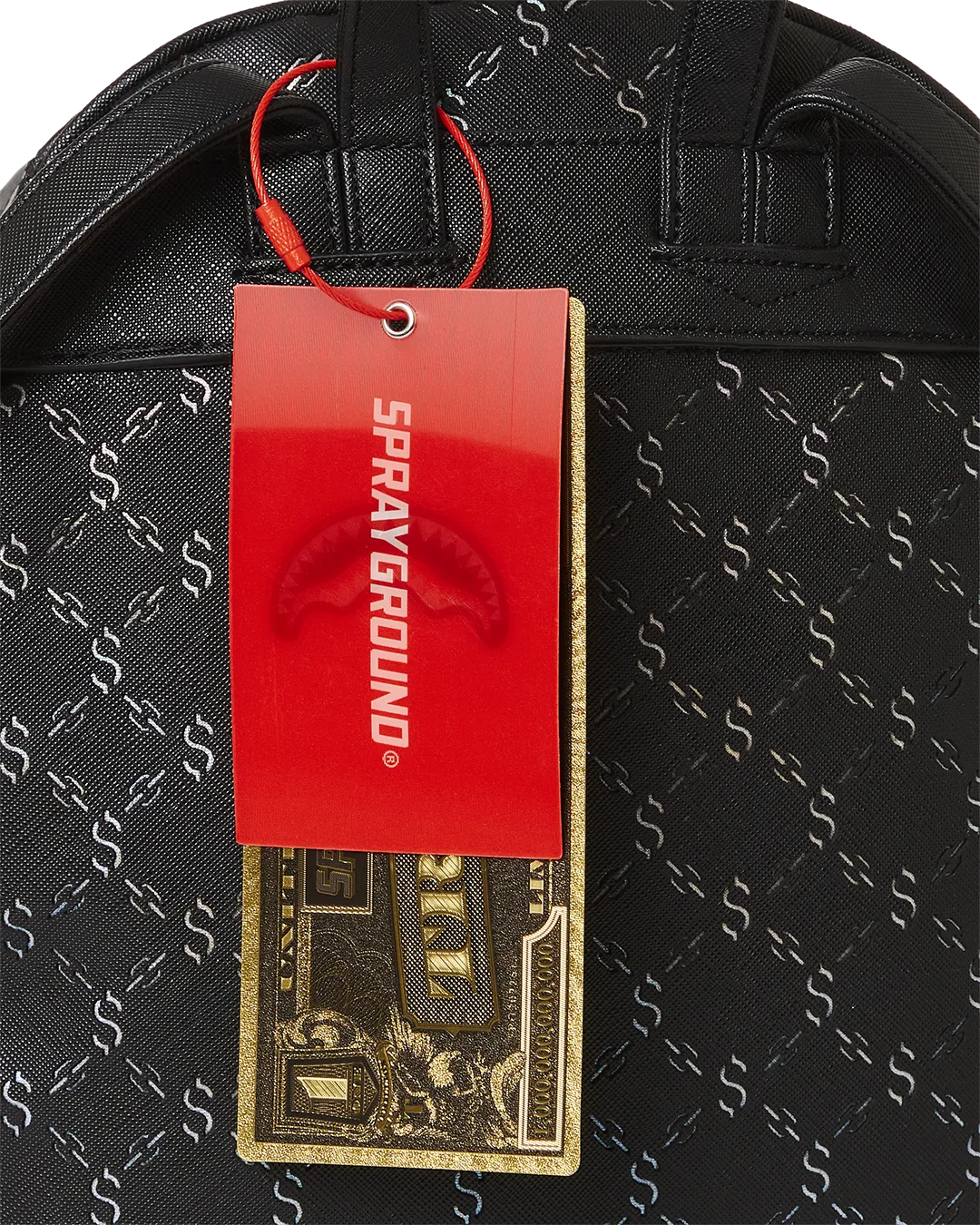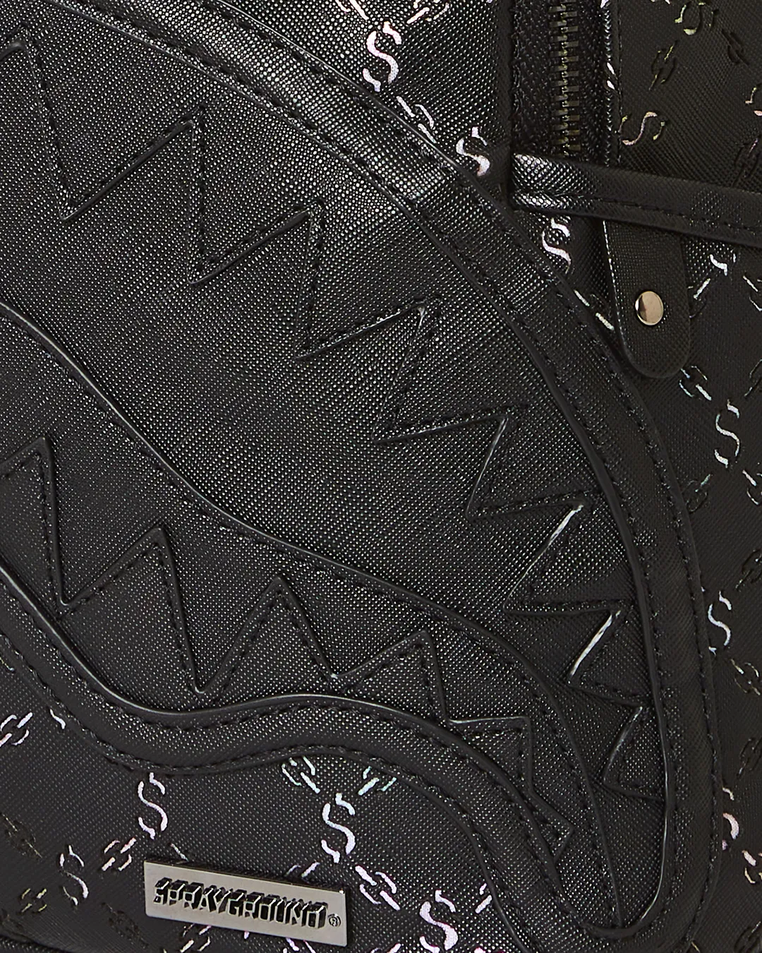 100% PVC with exclusive laser cut money logo pattern applied over metallic iridescent ?fabric to give a touch of shimmer to the fabric
