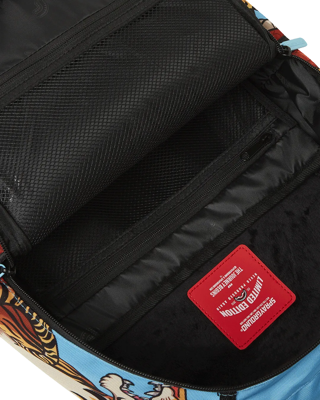 Dimensions: 18″ x 6″ x 11.5″ ? Front zipper pocket ? Side pockets ? Zippered Stash pocket ? Separate velour sunglass compartment ? Ergonomic mesh back padding ? Adjustable Straps for custom sizing ? Gold zippers with metal hardware ? Metal “Sprayground Authentic” badge ? Slide through back sleeve connects to carry-on luggage to free your hands