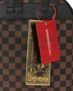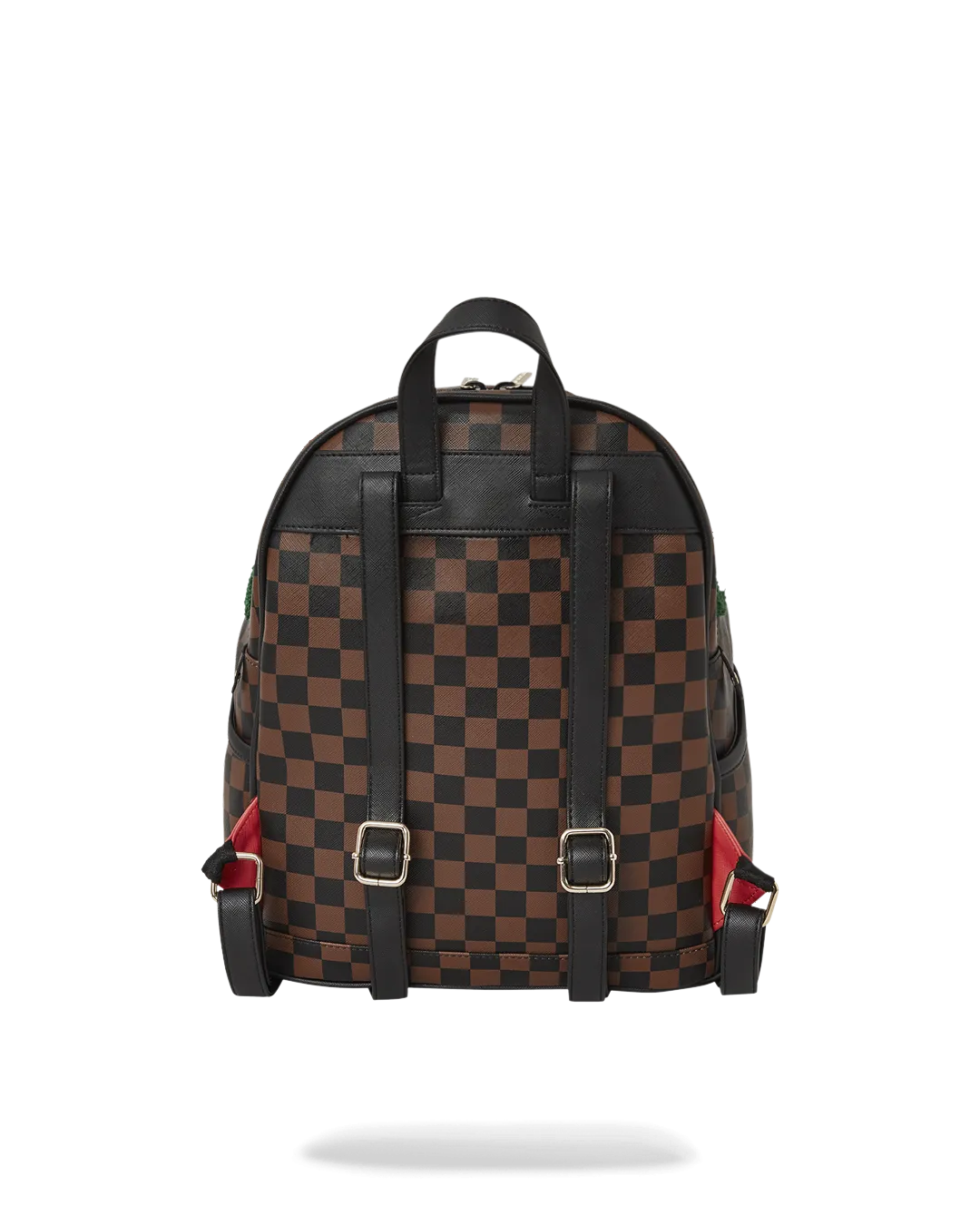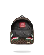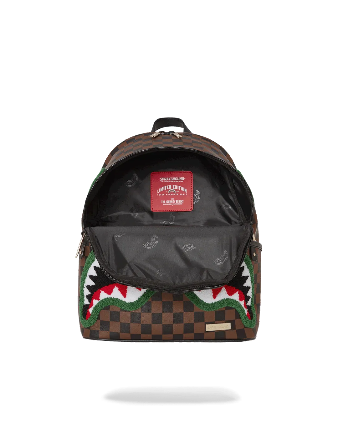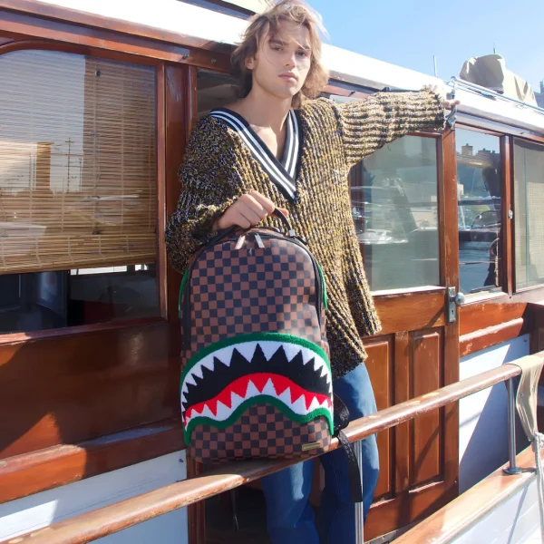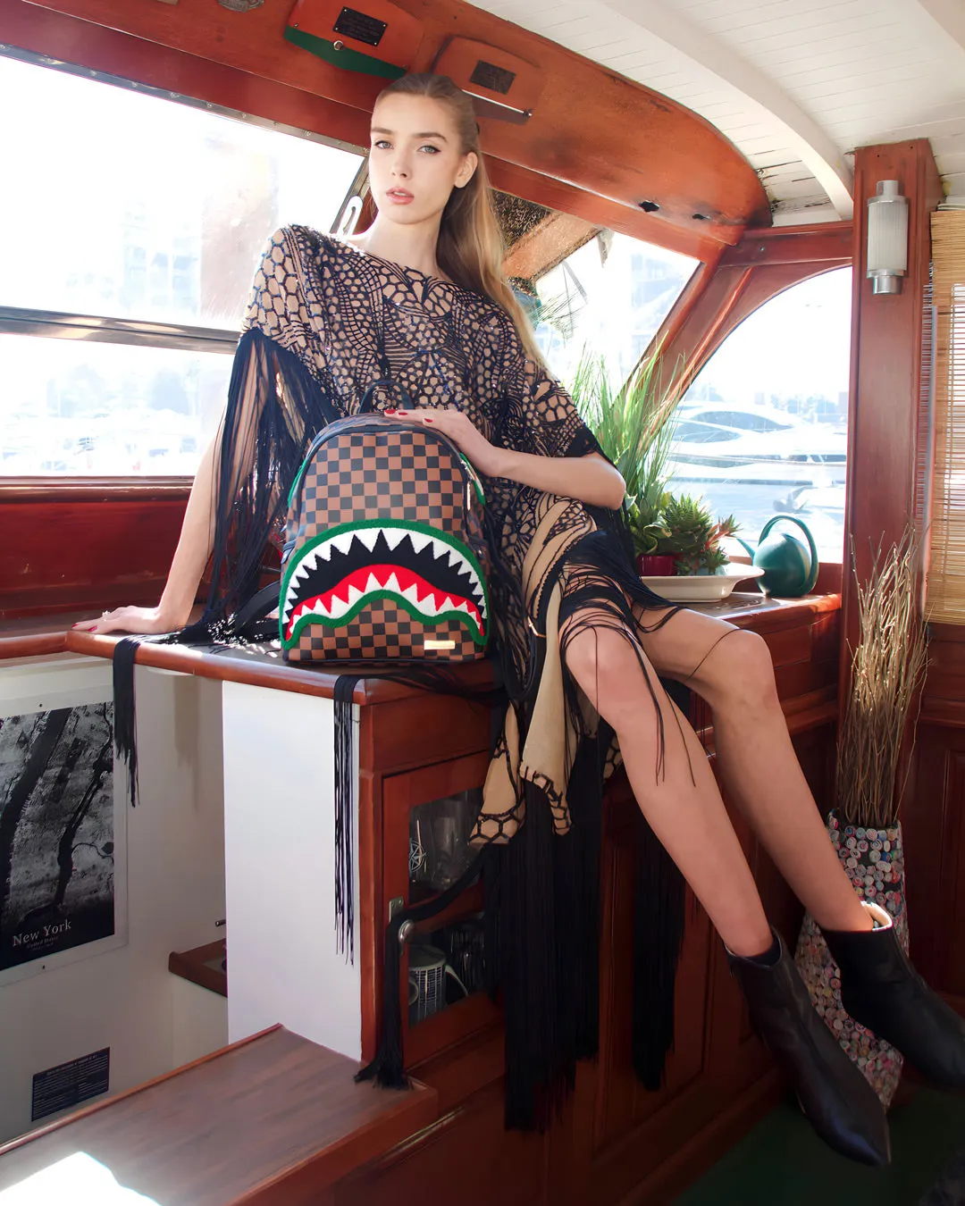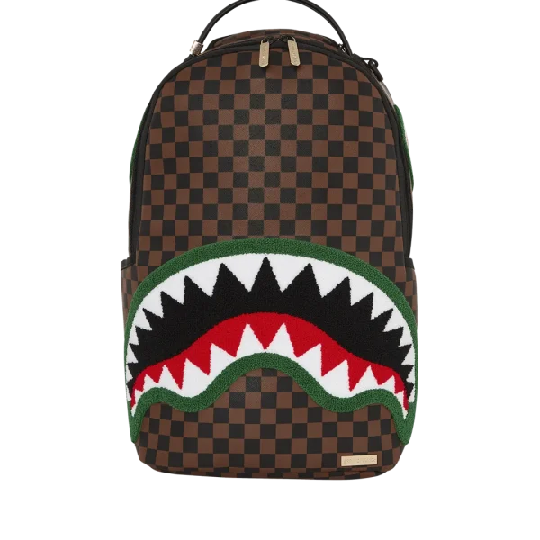 100% PVC Sharks in Paris check pattern on PVC material with textured chenille shark mouth on top featuring gold hardware
