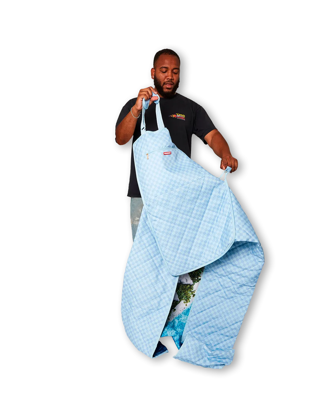 Water resistant transformable bag/beach blanket. Folds into itself for convenience.?