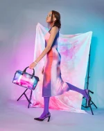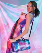 100% PVC silver metallic with tie-dye print and silver hardware.