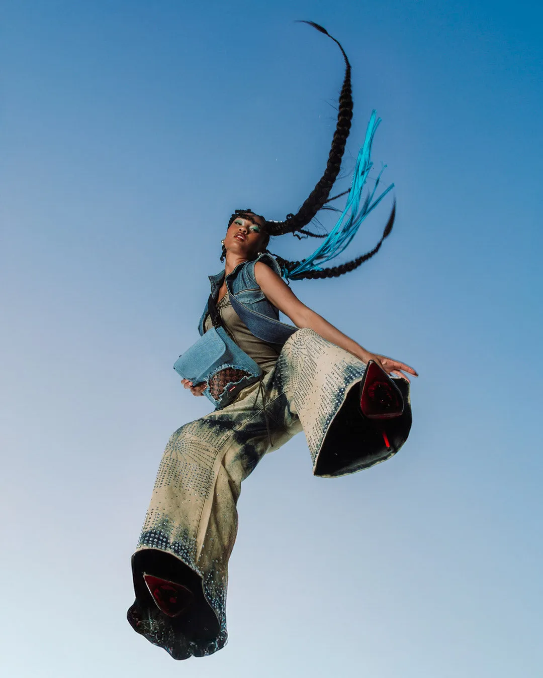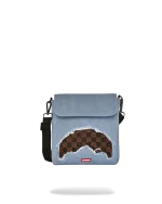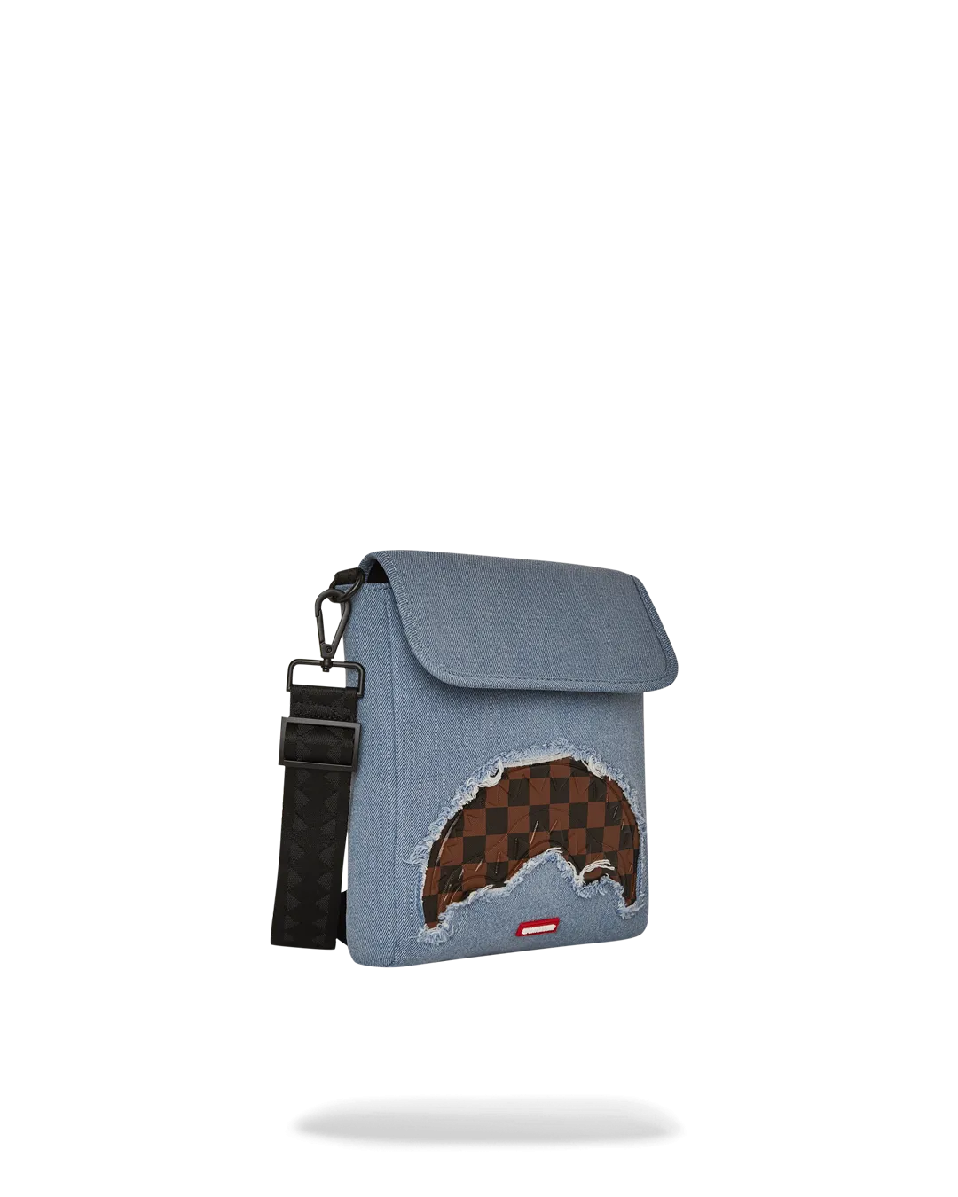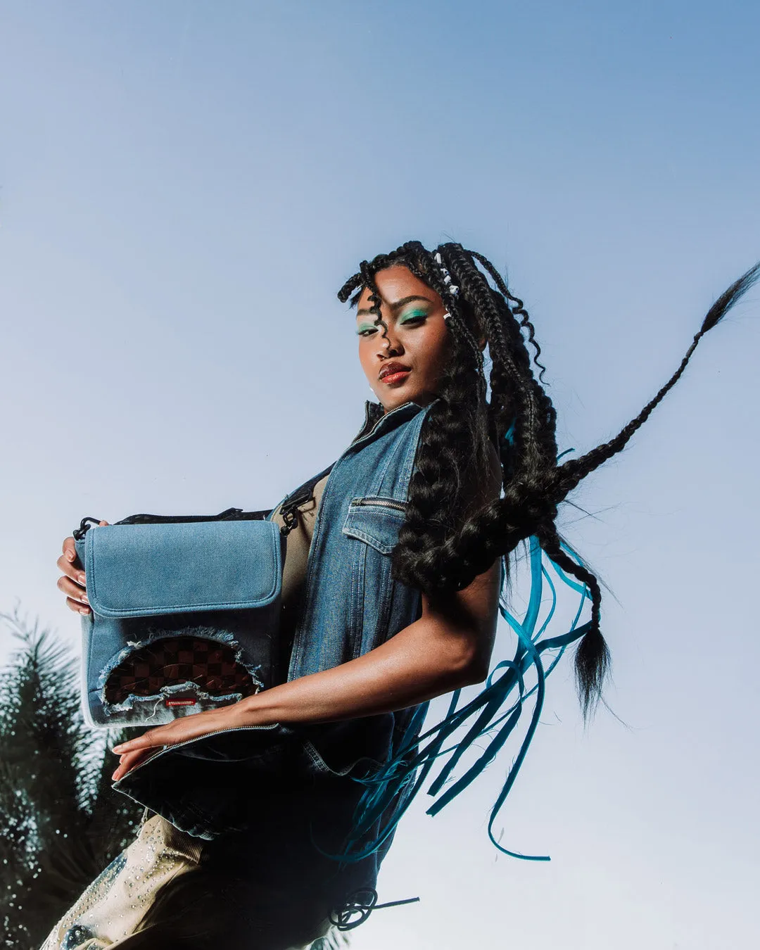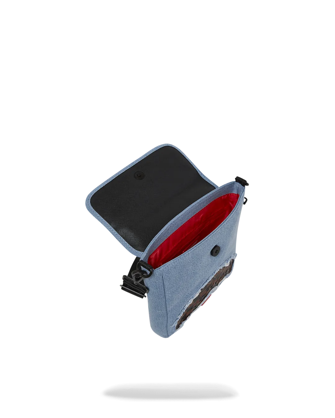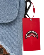 100% cotton denim bag with embossed details such as the sharkmouth and zipper pullers. Sewn faux leather details around the front zipper pocket. Adjustable strap.