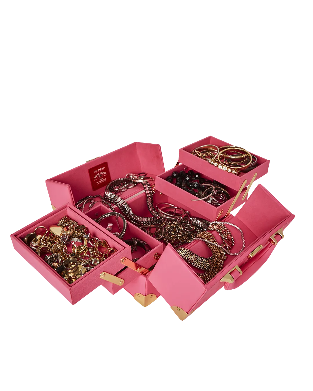 Red velour lining, Tiered shelving, removable tray, ?interior mirror.