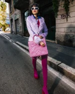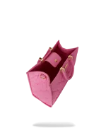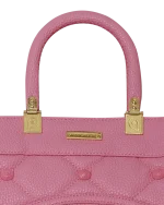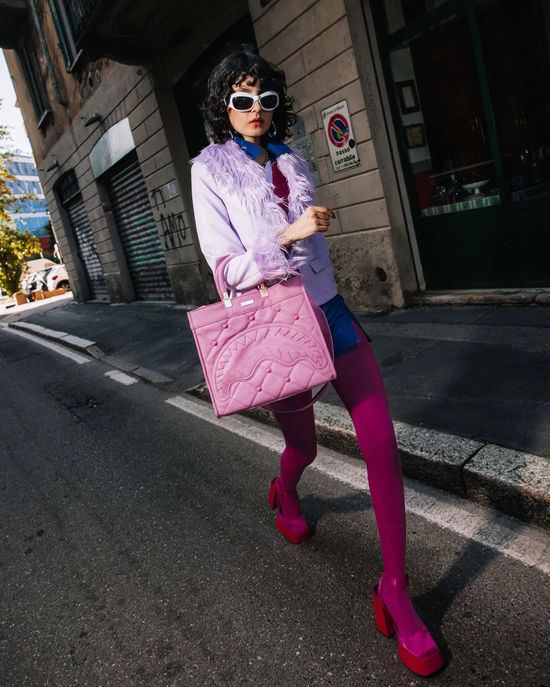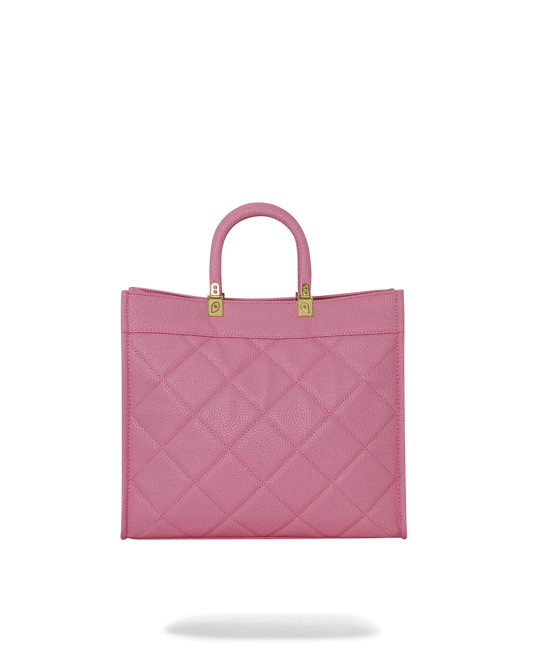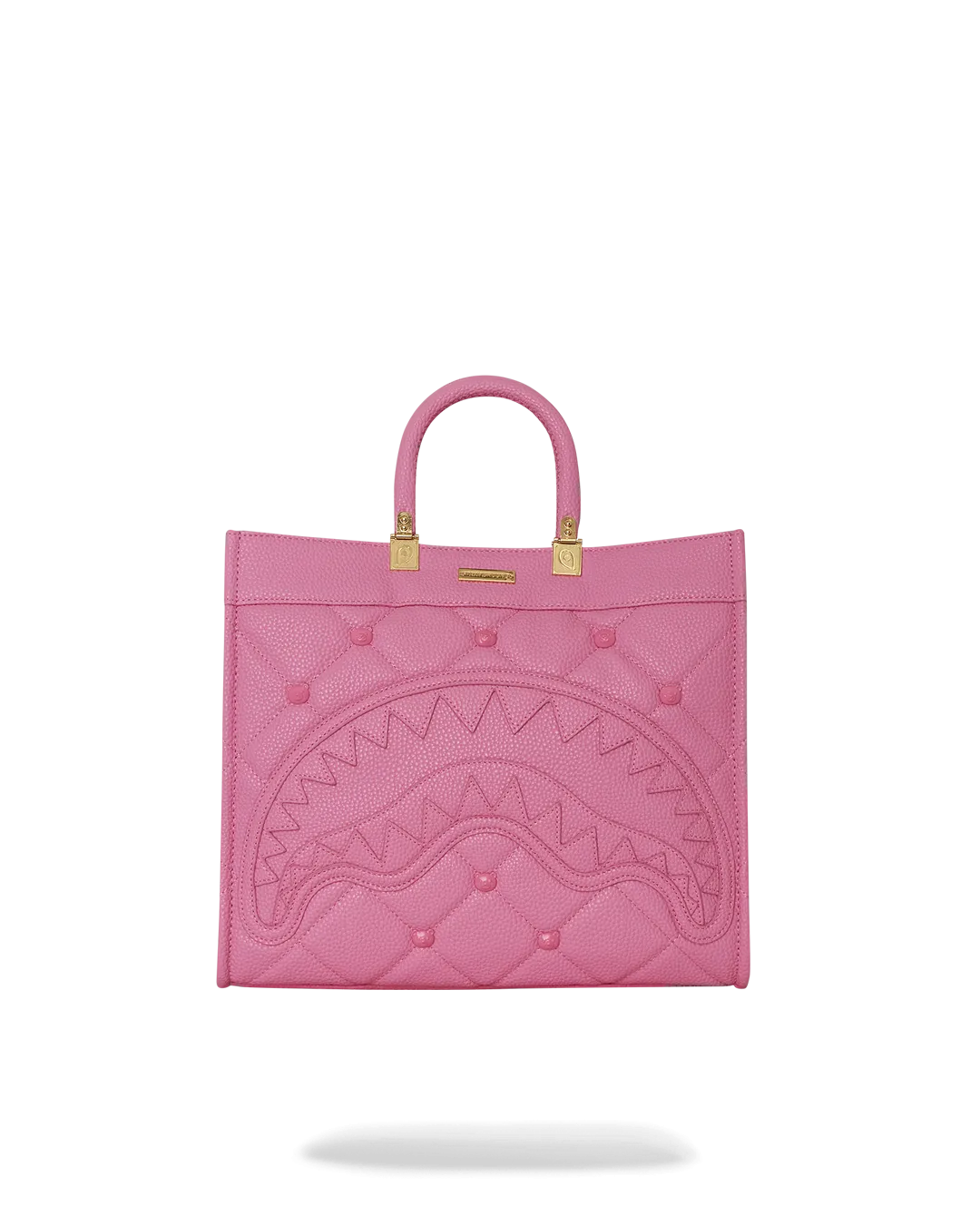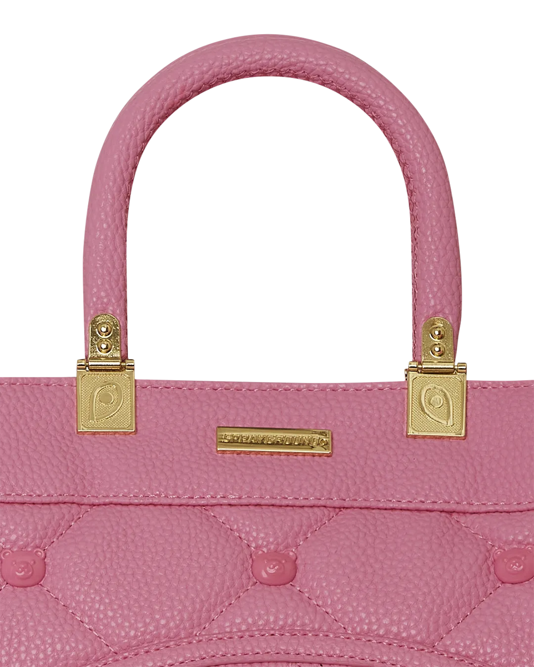 Pink quilted with bear face studs. ?Pink enamel & gold hardware details?