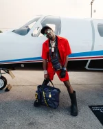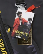 Fabric made from polyester satin weave with monochromatic camo details and contrast yellow trims