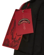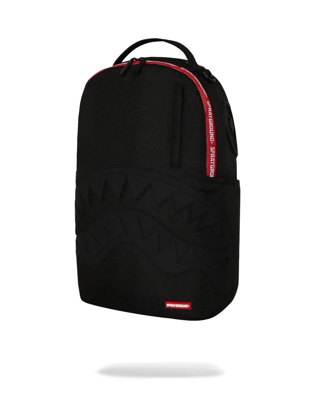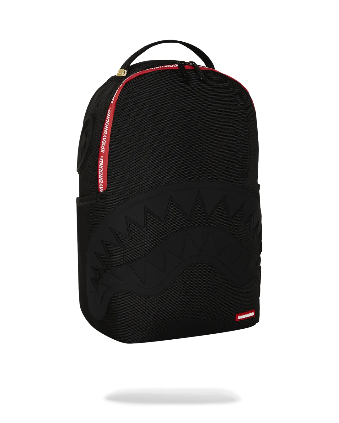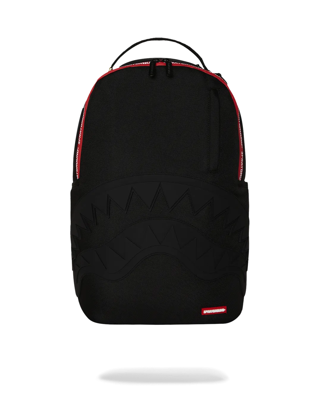 Ballistic polyester with SPRAYGROUND printed zipper tape and a rubber sharkmouth.
