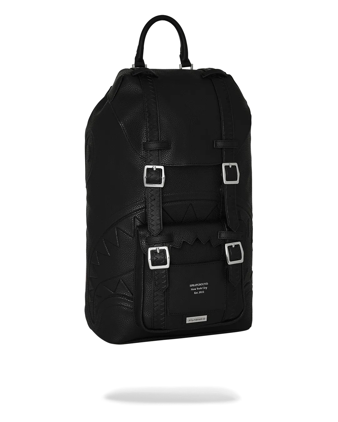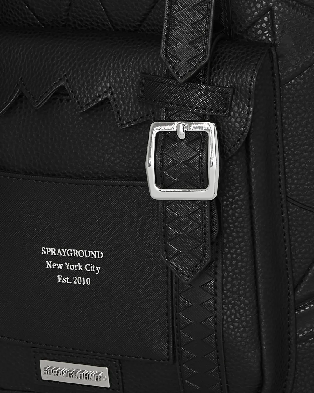 Cut and sew sharkmouth shape with embossed silver foil lettering