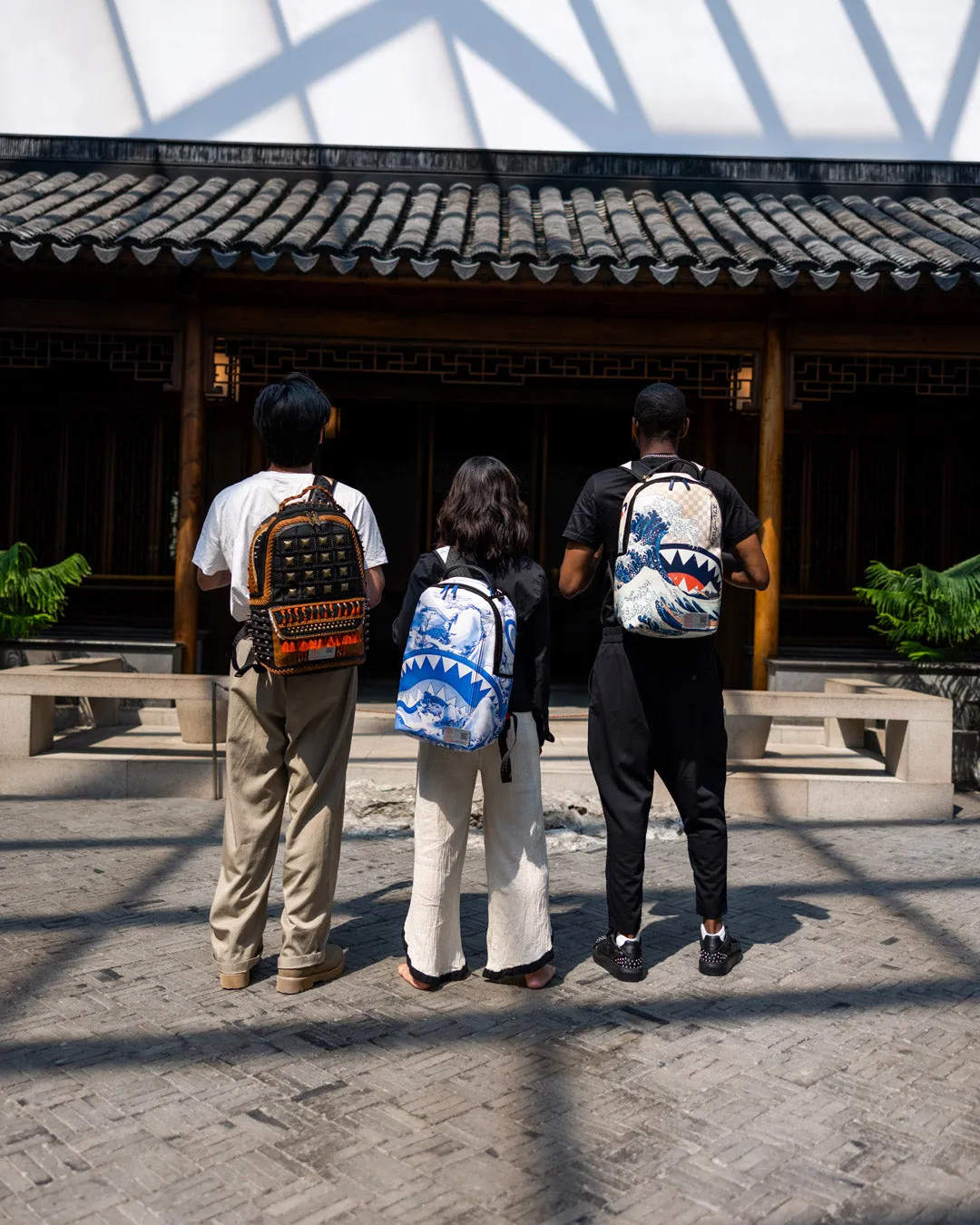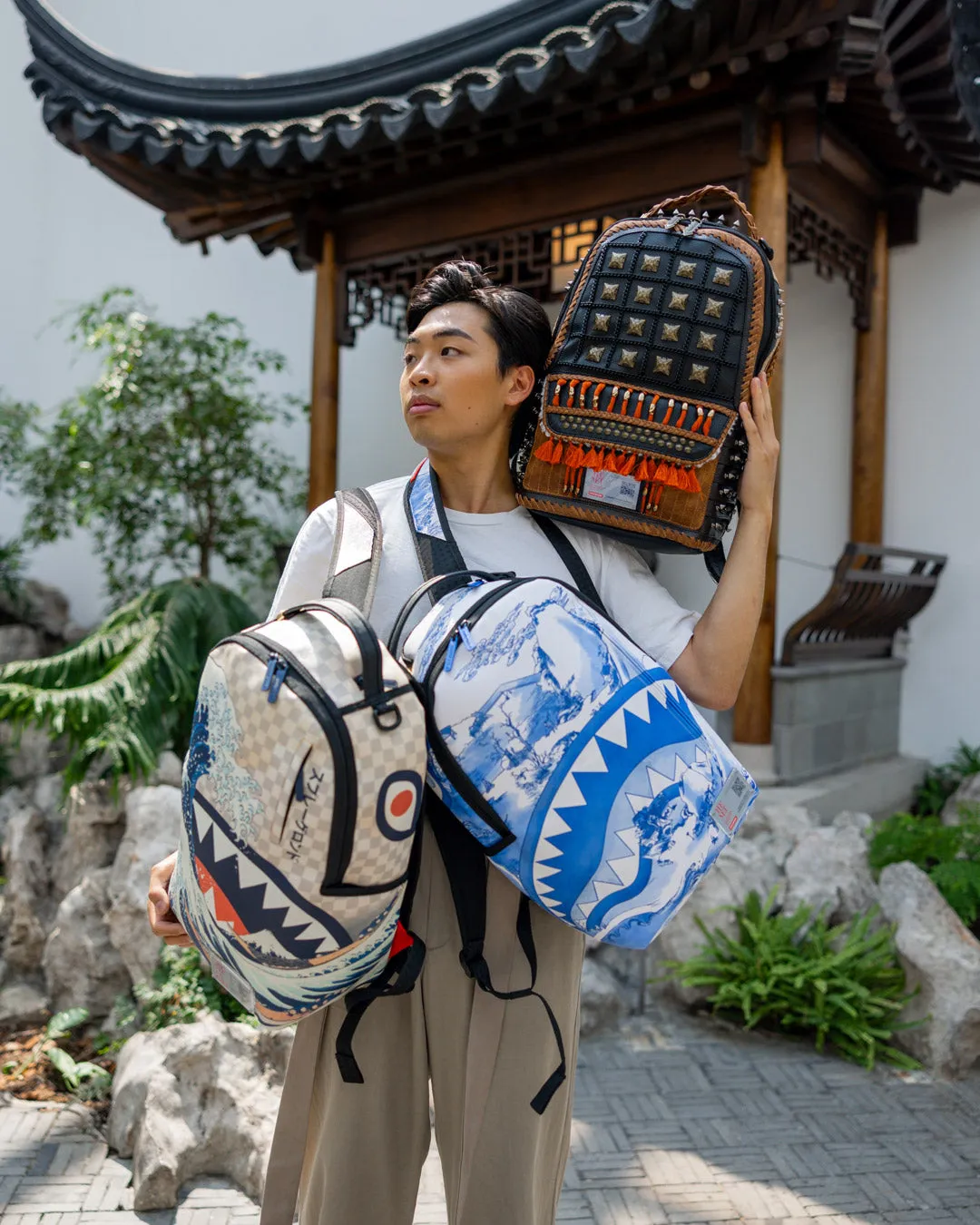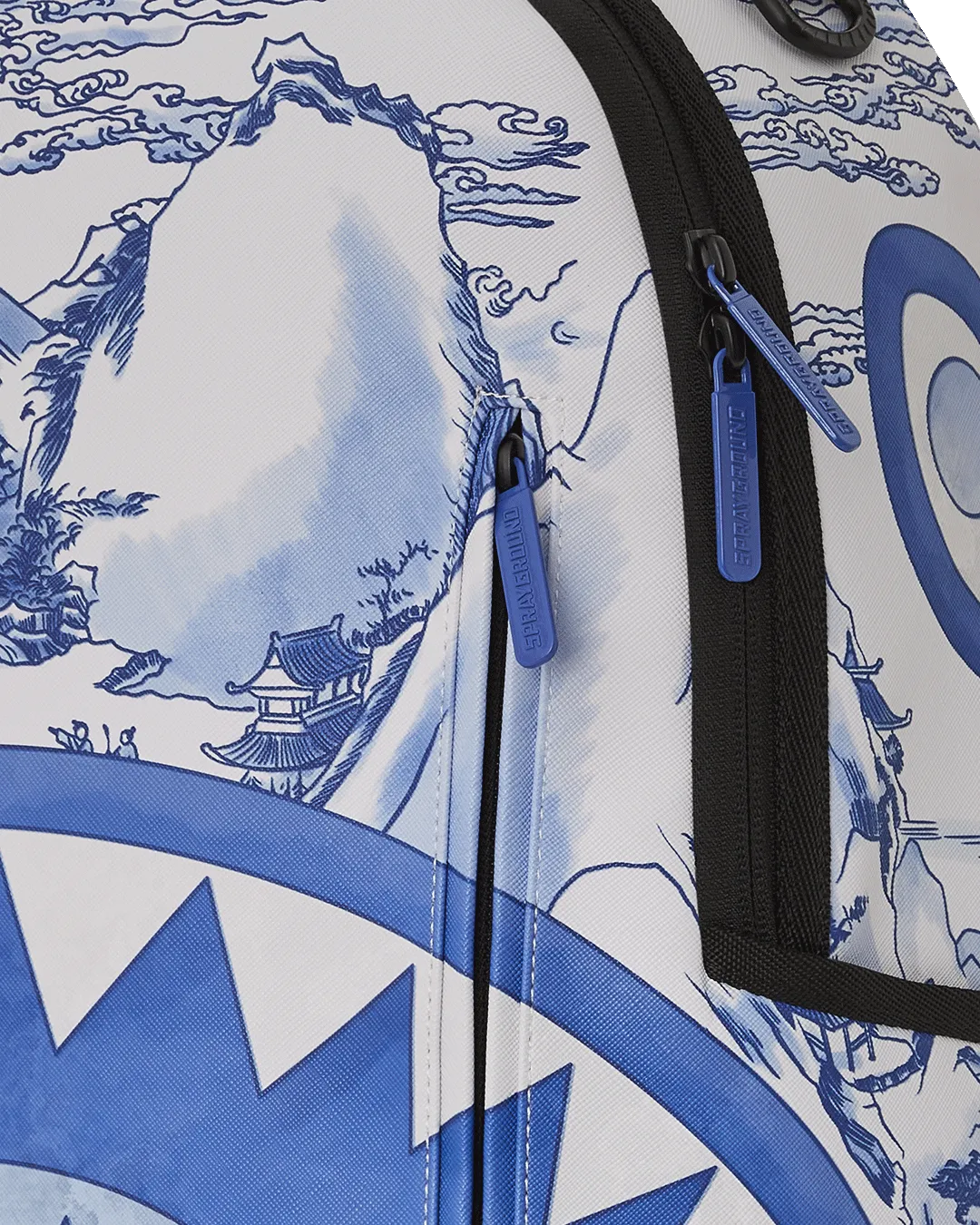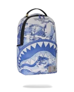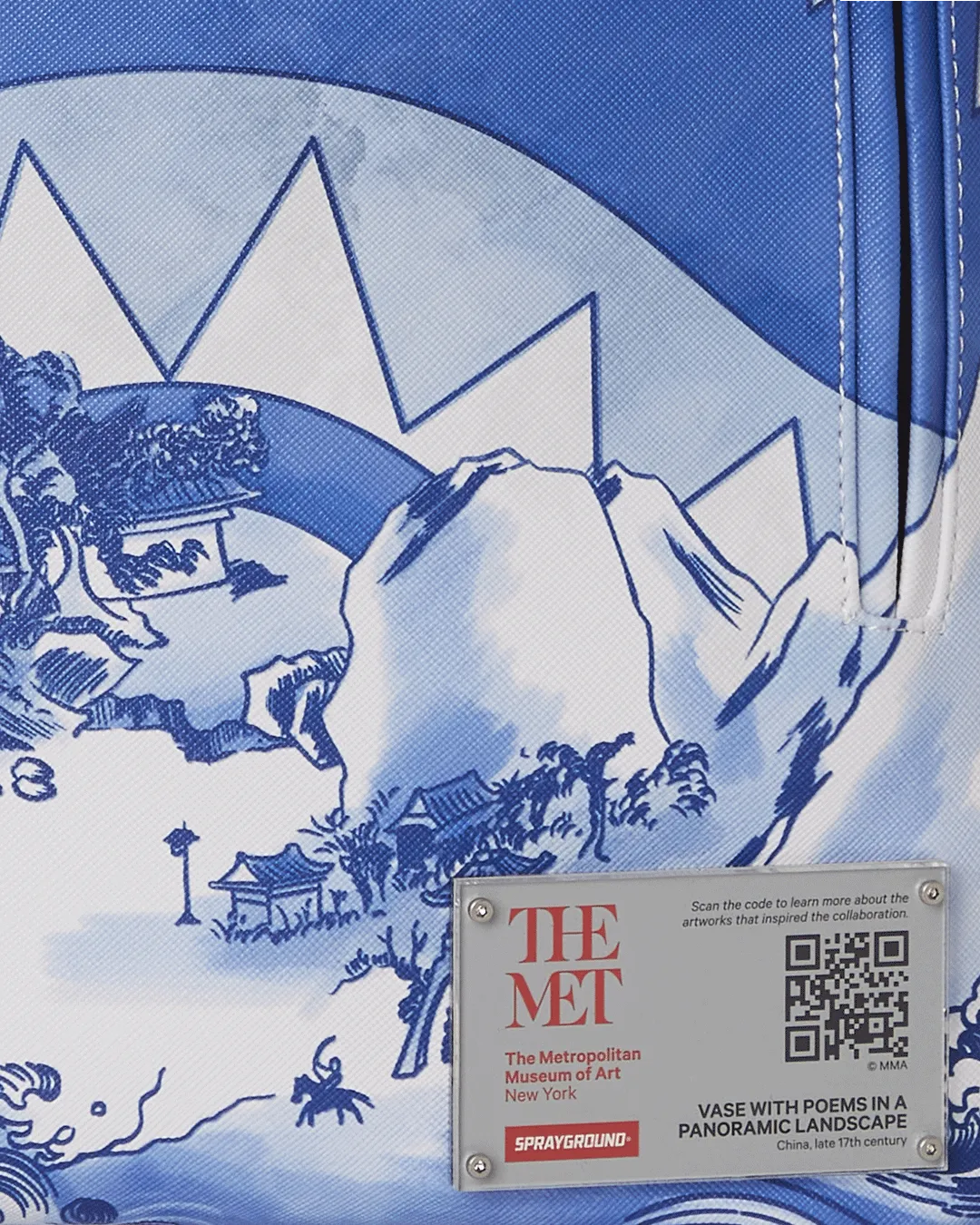 Sprayground??s signature shark mouth emerges from a Chinese landscape adapted from a late 17th-century vase in The Met collection. The Museum??s porcelain vase??an example of so-called Jingdezhen ware??commemorates a literary gathering in the 1690s at the city of Jingdezhen, a major production center of Chinese ceramics. The original vessel is richly decorated with local sites and figure groups, as well as poems and transcriptions of an essay. Collectively, they tell the true story of strangers becoming friends despite traditional class boundaries.?