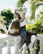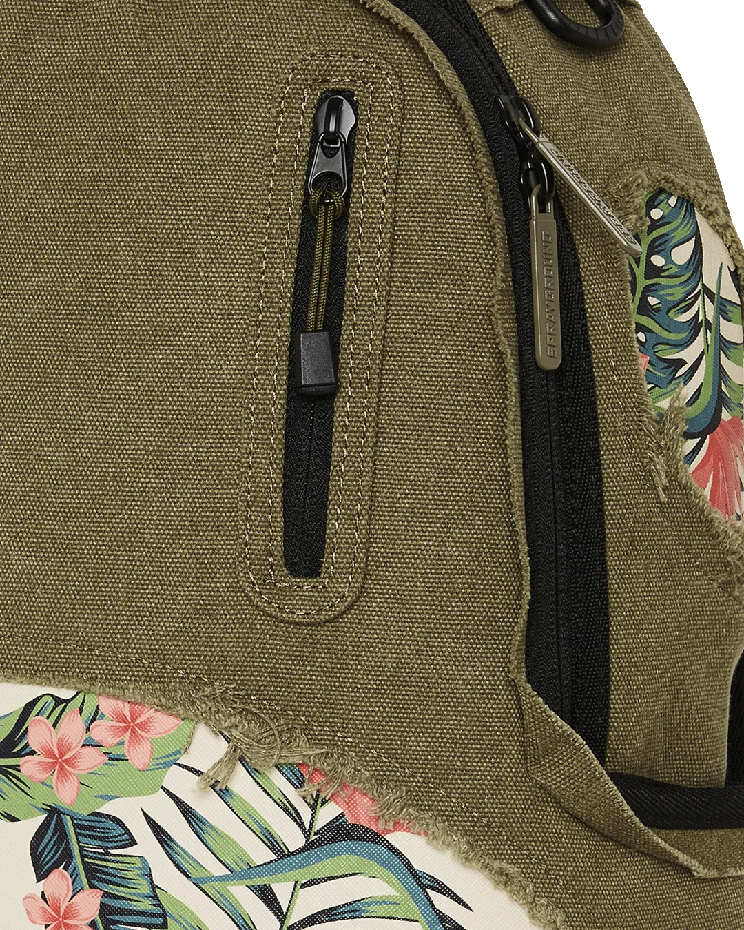 100% Cotton green army canvas over custom printed PVC leather mouth with fringe details Features an exterior cargo pocket & a vertical zipper pocket